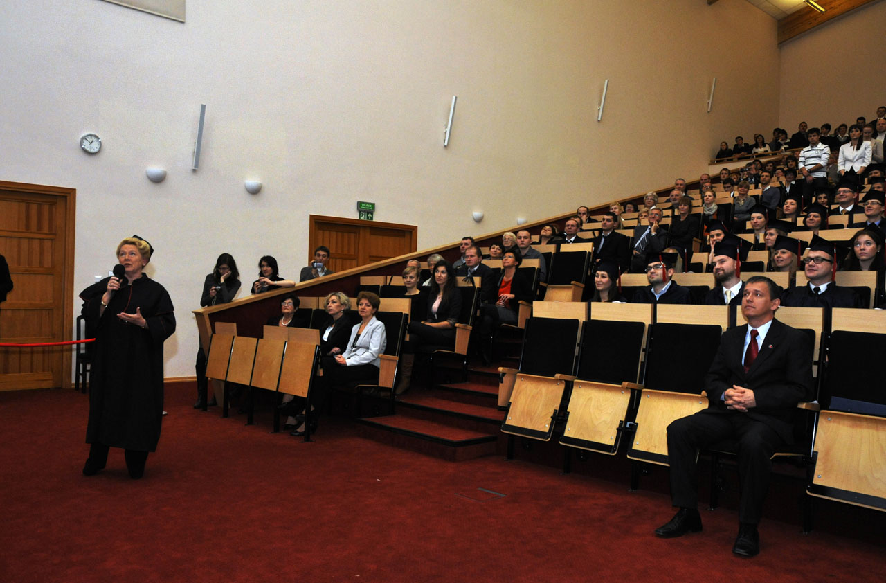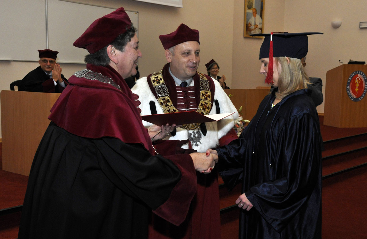 Absolwenci po złożeniu przyrzeczenia lekarskiego i zawodowego odebrali dyplomy z rąk Rektora GUMed, dziekana WL – prof. dr. hab. Janusza Sieberta oraz dr hab. Barbary Kochańskiej, prof. nadzw. Prof. dr hab. Barbara Adamowicz-Klepalska, kierownik Katedry i Zakładu Stomatologii Wieku Rozwojowego kierując kilka słów do absolwentów powiedziała między innymi o tym, że ”...nie było dotąd NOBLA w stomatologii, ale jest stomatologia w polskim NOBLU…” i odczytała wiersz W. Szymborskiej “Uśmiechy”.