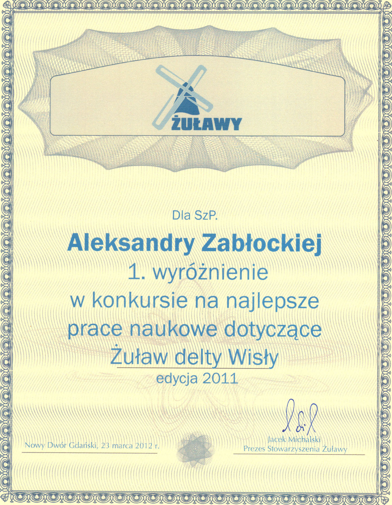 Praca magisterska “Analiza struktury przyjęć pacjentów w Poradni Hematologicznej w Elblągu” mgr Aleksandry Zabłockiej, napisana pod kierunkiem dr. hab. Jana Macieja Zauchy, prof. GUMed z Zakładu Propedeutyki Onkologii otrzymała wyróżnienie I stopnia w konkursie na najlepsze prace naukowe dotyczące regionu Żuław delty Wisły edycja 2011.