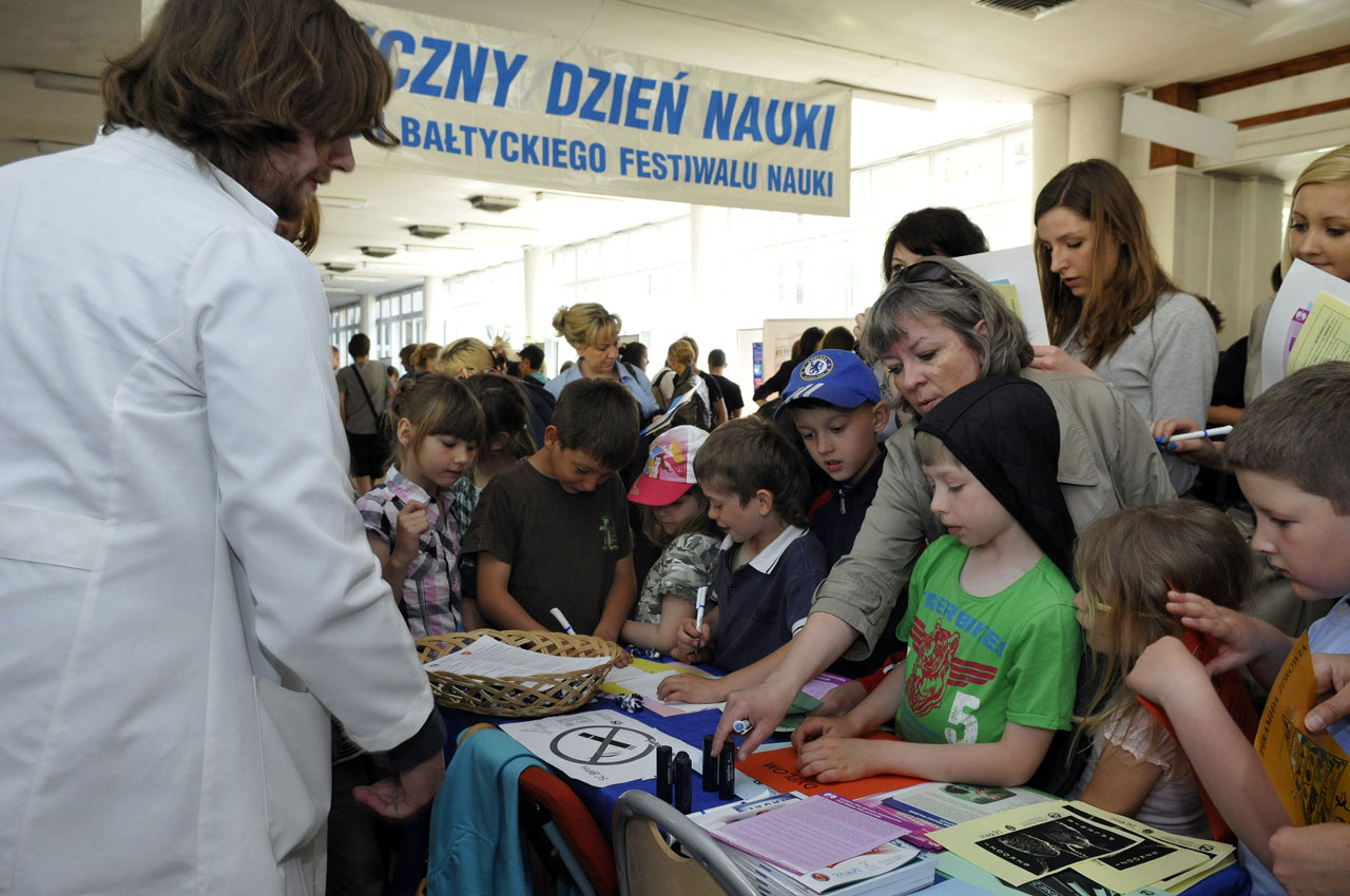 Podczas imprezy mali i więksi uczestnicy mogli dowiedzieć się m.in. co mają w genach, czy otyłość może być chorobą zakaźną i jak samodzielnie wykonać maści i tabletki. Nie zabrakło nauki samobadania piersi na fantomach, warsztatów z udzielania pierwszej pomocy czy nauki chirurgicznego szycia. Wszyscy odważni mogli sprawdzić lecznicze właściwości prądu, skorzystać z badania kapilaroskopem, a dzięki pomysłowości pracowników Biblioteki Głównej zrobić sobie zabawne pamiątkowe zdjęcie. W fascynujący świat inżynierii klinicznej zabrali nas specjaliści z Zakładu Radiologii, a o tym dlaczego miłość działa jak narkotyk opowiedzieli w języku hiszpańskim pracownicy Studium Praktycznej Nauki Języków Obcych. Ogromnym powodzeniem cieszyło się stoisko debiutujących w tym specjalistów z Katedry i Zakładu Farmakognozji, na którym można było zdobyć sadzonki rosiczek oraz młodych dietetyków, którzy zadbali o smaczne, proste, a przede wszystkim zdrowe przekąski. Medyczny Dzień Nauki odbył się 25 maja w godz. 9-14 w Collegium Biomedicum w Gdańsku w ramach X Bałtyckiego Festiwalu Nauki.