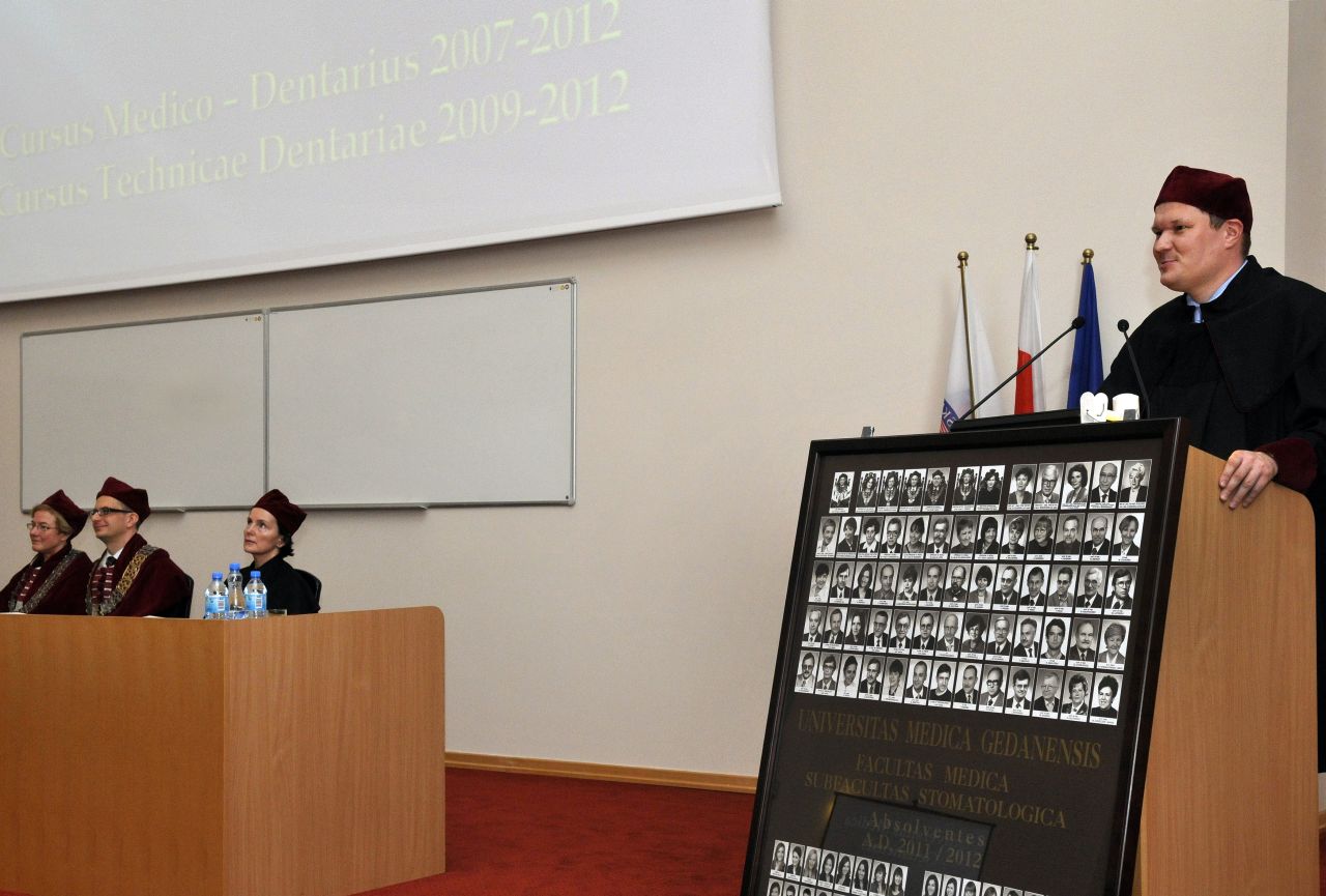 Absolwenci kierunku lekarsko-dentystycznego rocznika 2007-2012 i kierunku techniki dentystyczne rocznika 2009-2012 odebrali 23 listopada br. dyplomy. Uroczystość odbyła się w Auditorium Primum im. Olgierda Narkiewicza w Atheneum Gedanense Novum. Dyplomy odebrało 63 absolwentów kierunku lekarsko-dentystycznego i 29 kierunku techniki dentystyczne. Podczas dyplomatorium głos zabrał m.in. prorektor prof. Marcin Gruchała, dr hab. Marek Niedoszytko, kierownik Oddziału Stomatologicznego, wiceprezes Okręgowej Rady Lekarskiej w Gdańsku Dariusz Kutella oraz lek. dent. Marcin Derwich, absolwent kierunku lekarsko-dentystycznego. Na uroczystości obecni byli również m.in. dr hab. Barbara Kamińska, prof. nadzw., kierownik Katedry i Kliniki Pediatrii, Gastroenterologii, Hepatologii i Żywienia Dzieci, prorektor ds. studenckich w kadencji 2008-2012, prof. dr hab. Barbara Adamowicz-Klepalska, wieloletni kierownik Katedry i Zakładu Stomatologii Wieku Rozwojowego oraz dr Henryk Zawadzki, docent, opiekun studentów I roku WL i OS.