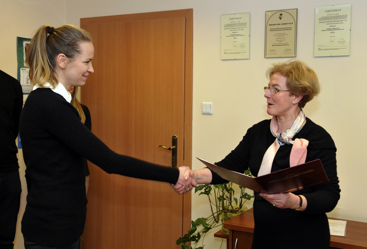 Dziekan Wydziału Lekarskiego – dr hab. Maria Dudziak, prof. nadzw. spotkała się 4 lutego br. ze studentami ostatnich lat studiów kierunku lekarskiego i lekarsko-dentystycznego, którzy jako ochotnicy uczestniczyli w dyplomatoriach WL absolwentów z roku akademickiego 2011/2012. Dziekan, w podziękowaniu za pomoc w organizacji uroczystości, wręczyła zaproszonym listy i nagrody książkowe.