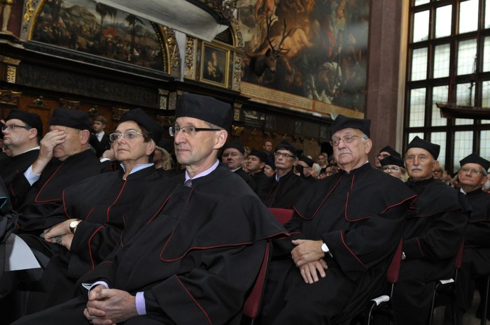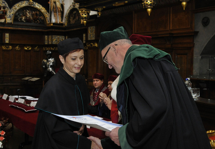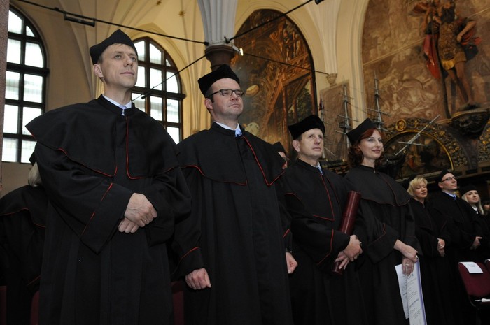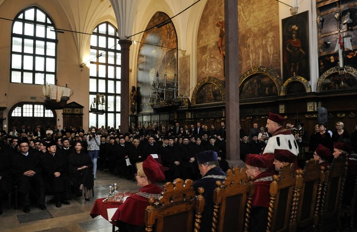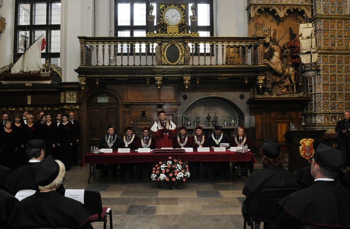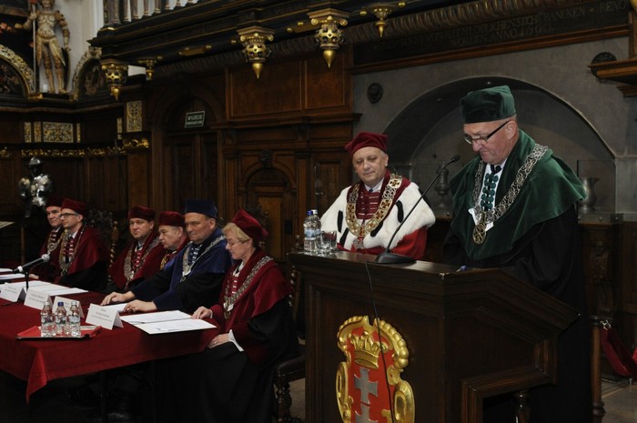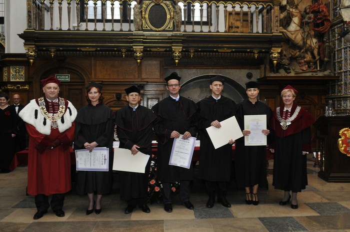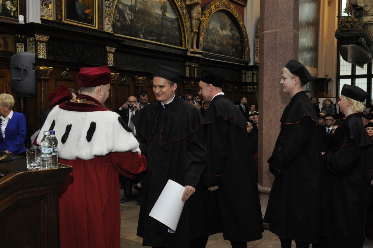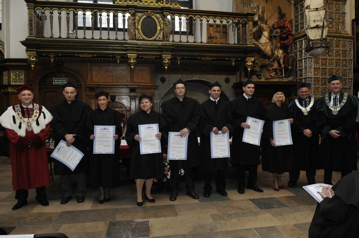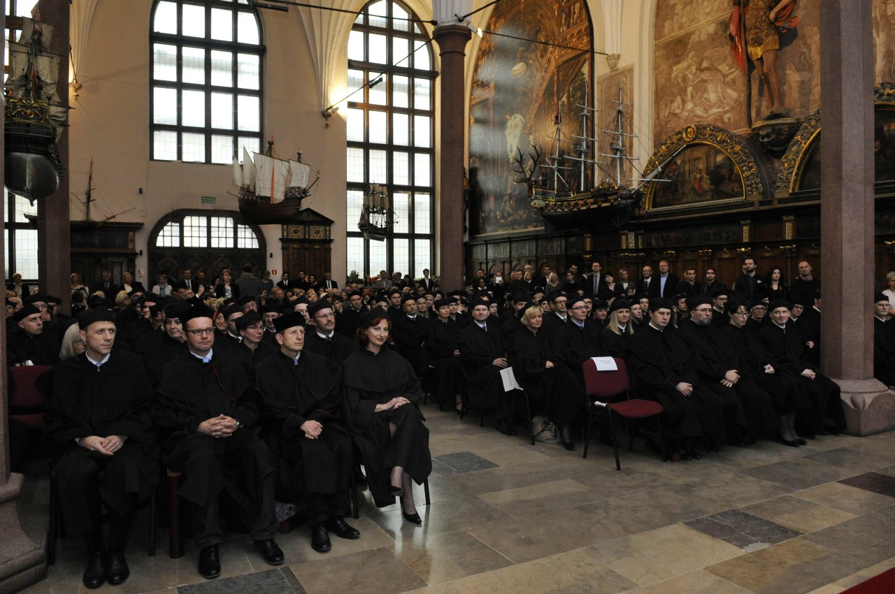 Tradycyjnie w Dworze Artusa wręczono dyplomy doktora habilitowanego nauk medycznych i doktora habilitowanego nauk farmaceutycznych oraz promocje na stopień naukowy doktora nauk medycznych, doktora nauk o zdrowiu i doktora nauk farmaceutycznych doktorantów Wydziałów Lekarskiego, Nauk o Zdrowiu i Farmaceutycznego GUMed. Uroczystość odbyła się 23 października br. Uczestniczył w niej zespół promocyjny w składzie: rektor prof. Janusz Moryś, prorektor ds. nauki prof. Tomasz Bączek, prorektor ds. studenckich prof. Marcin Gruchała, prorektor ds. klinicznych prof. Andrzej Basiński, prorektor ds. rozwoju i organizacji kształcenia prof. Leszek Bieniaszewski, dziekan Wydziału Lekarskiego dr hab. Maria Dudziak, prof. nadzw. GUMed, dziekan Wydziału Farmaceutycznego prof. Wiesław Sawicki, dziekan Wydziału Nauk o Zdrowiu prof. Piotr Lass oraz 36 promotorów Wydziału Lekarskiego, 13 promotorów Wydziału Nauk o Zdrowiu i 3 promotorów Wydziału Farmaceutycznego.