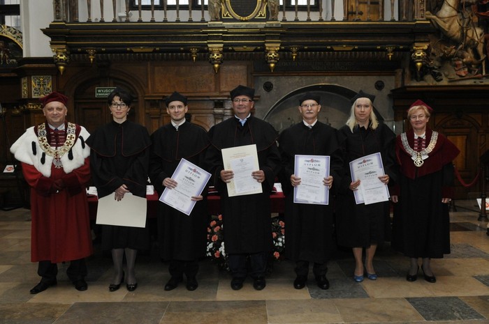 Dziekan Wydziału Farmaceutycznego wręczył dyplomy doktora habilitowanego nauk farmaceutycznych: dr. hab. Rafałowi Bartoszewskiemu, dr hab. Katarzynie Gobis, dr hab. Alinie Plenis, dr. hab. Jarosławowi Sączewskiemu, dr. hab. Tomaszowi Śledzińskiemu, dr. hab. Bartoszowi Wielgomasowi oraz dr hab. Agnieszce Zimmermann.