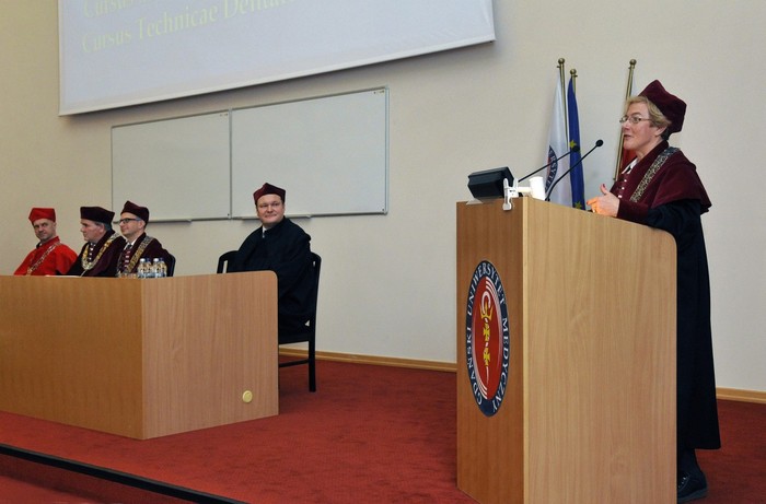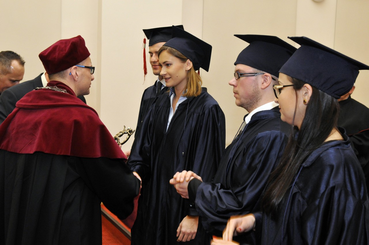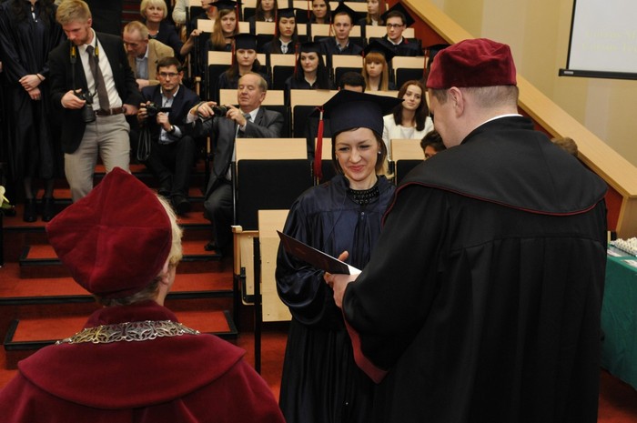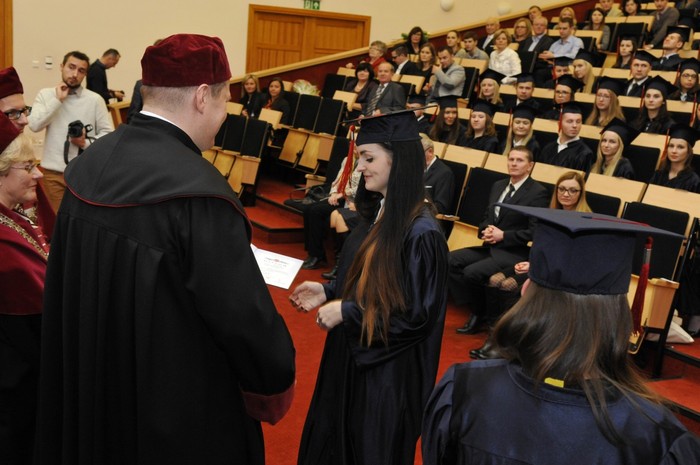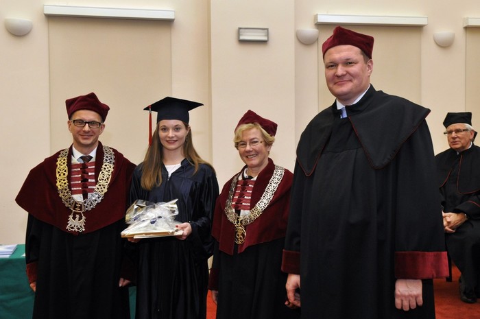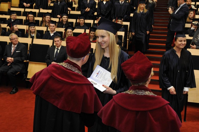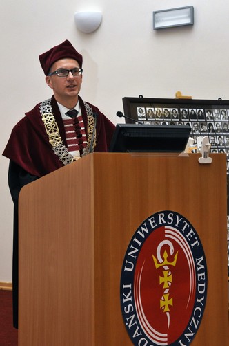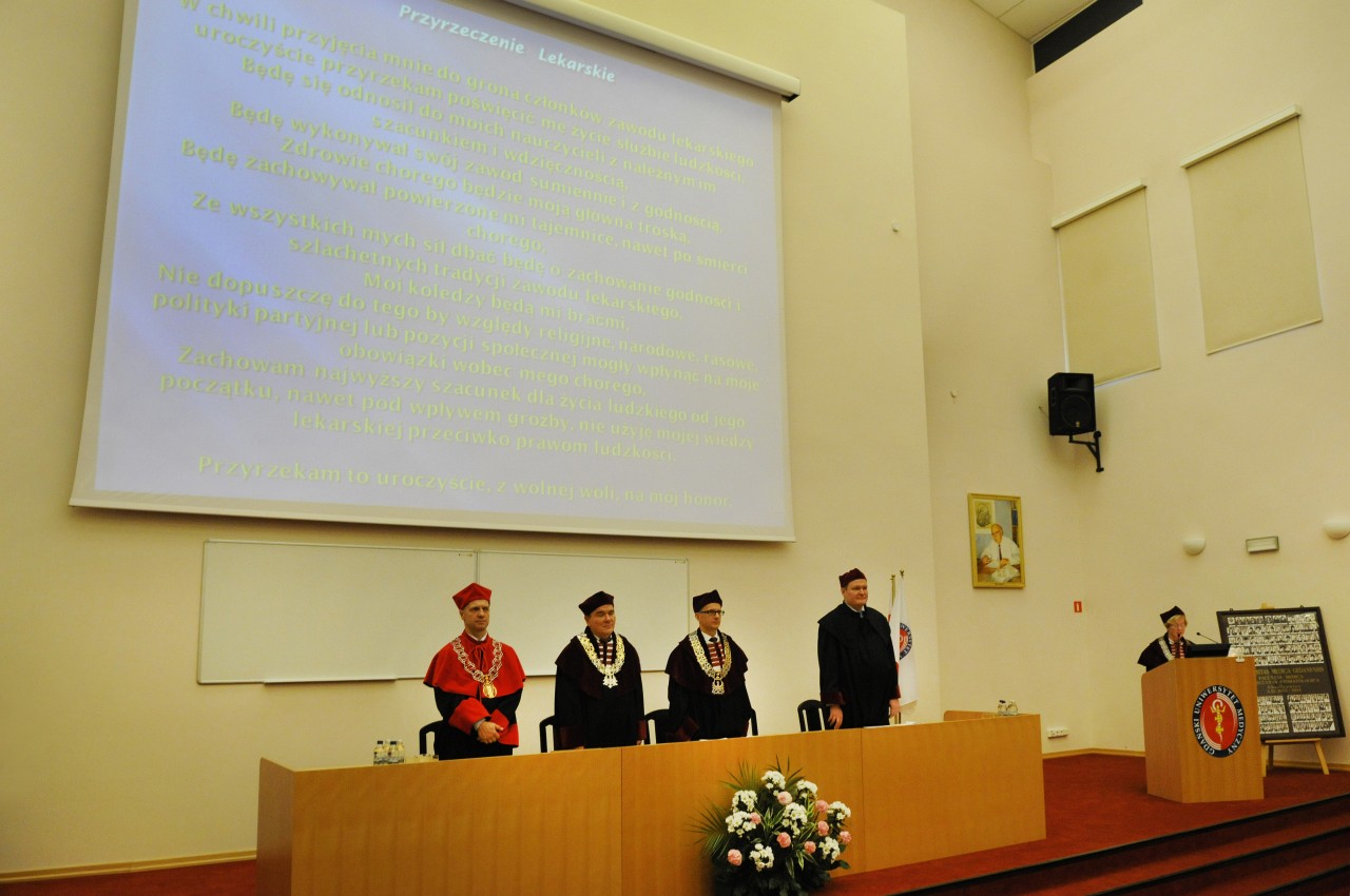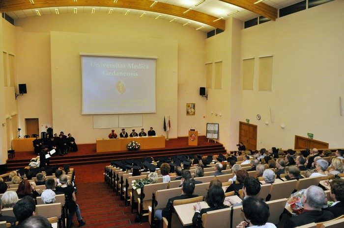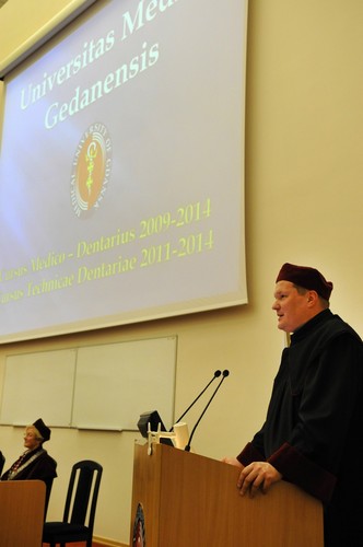 Absolwenci kierunku lekarsko-dentystycznego rocznika 2009-2014 i kierunku techniki dentystyczne rocznika 2011-2014 odebrali dyplomy 21 listopada br. z rąk prorektora ds. studenckich prof. Marcina Gruchały, dziekana Wydziału Lekarskiego prof. Marii Dudziak oraz prodziekana WL, kierownika Oddziału Stomatologicznego dr. hab. Marka Niedoszytko. Uroczystość odbyła się w Auditorium Primum im. Olgierda Narkiewicza w Atheneum Gedanense Novum. Dyplomy odebrało 55 absolwentów kierunku lekarsko-dentystycznego i 25 kierunku techniki dentystyczne. Przemówienia wygłosili prorektor prof. Marcin Gruchała, dziekan prof. Maria Dudziak, prodziekan dr hab. Marek Niedoszytko oraz zaproszeni honorowi goście: lek. dent. Halina Porębska, wiceprezes Okręgowej Rady Lekarskiej w Gdańsku, prof. Barbara Adamowicz-Klepalska, członek Rady Naukowej przy Ministrze Zdrowia, wieloletni kierownik Katedry i Zakładu Stomatologii Wieku Rozwojowego, prof. Maria Prośba-Mackiewicz, prezes Gdańskiego Oddziału PTS, wieloletni kierownik Zakładu Technik Dentystycznych i Zaburzeń Czynnościowych Narządu Żucia oraz prof. Zdzisław Bereznowski, wiceprezes Stowarzyszenia Absolwentów, kierownik Katedry i Zakładu Protetyki Stomatologicznej. Po uroczystym wręczeniu licznych nagród i listów gratulacyjnych dla wyróżnionych absolwentów głos zabrali: lek. dent. Agata Joniak, absolwentka kierunku lekarsko-dentystycznego oraz Paulina Wojtalik, przedstawiciel studentów V roku kierunku lekarsko-dentystycznego.