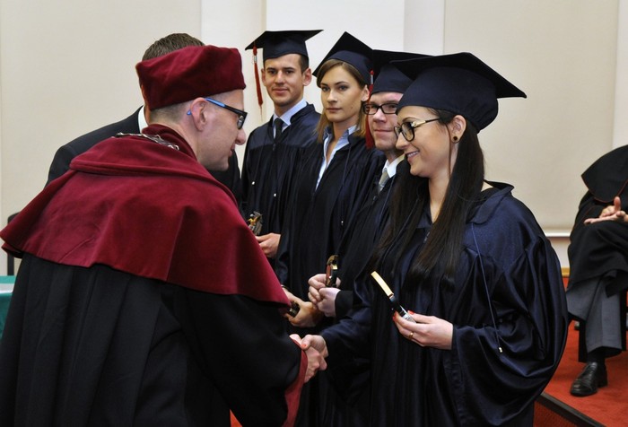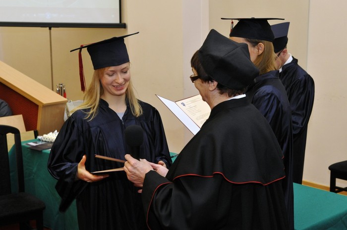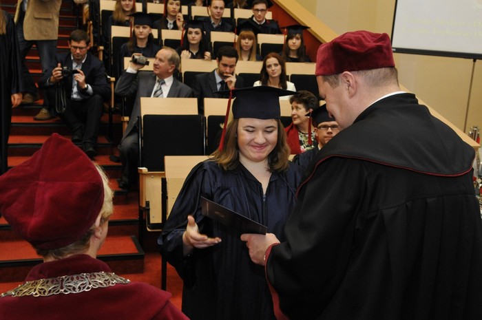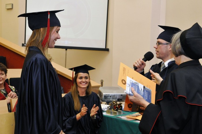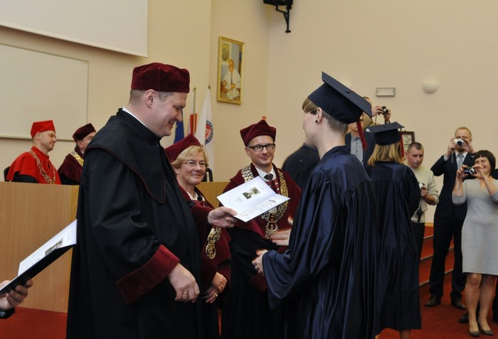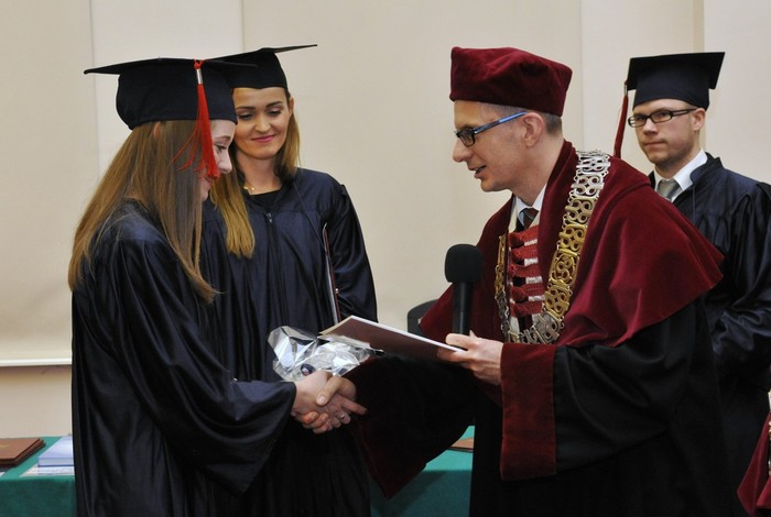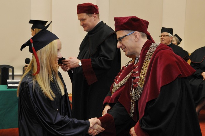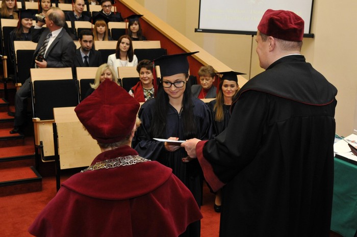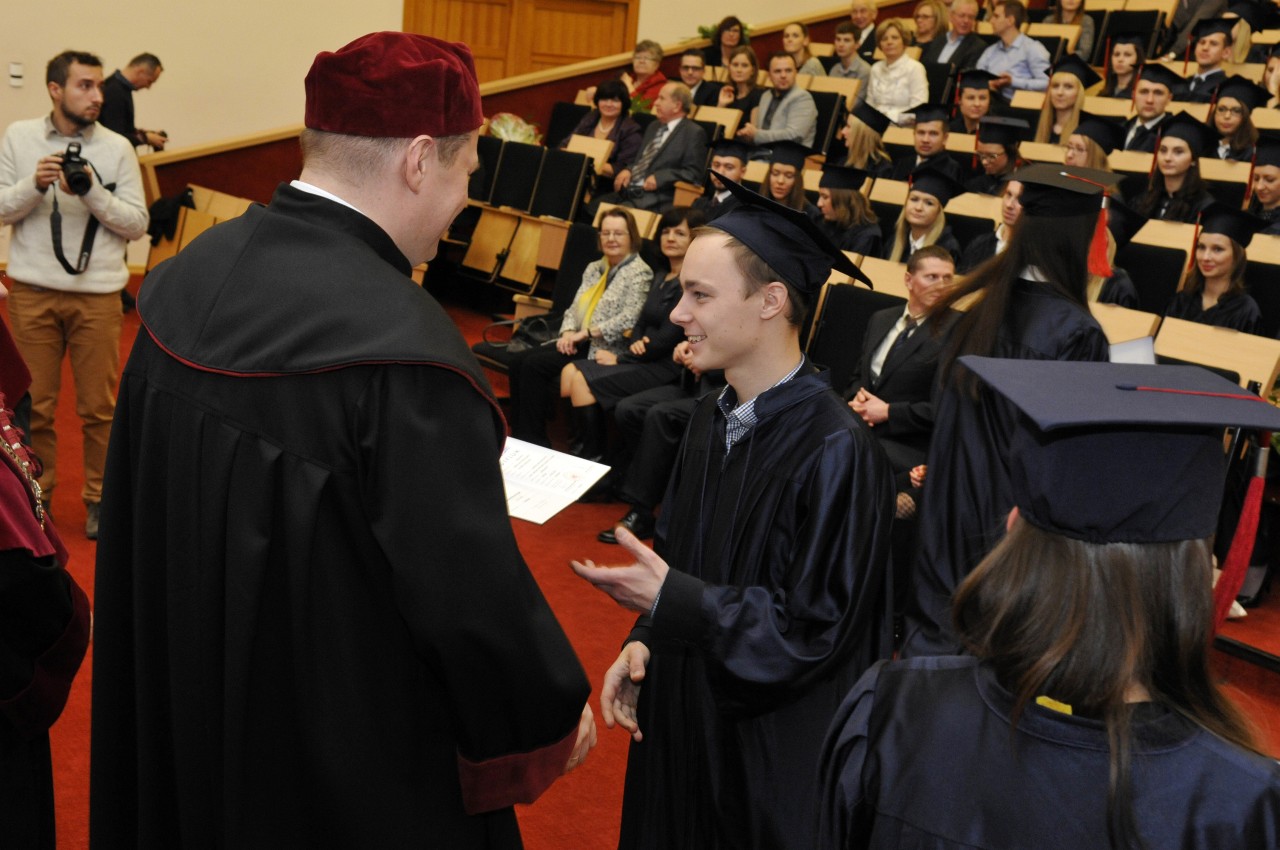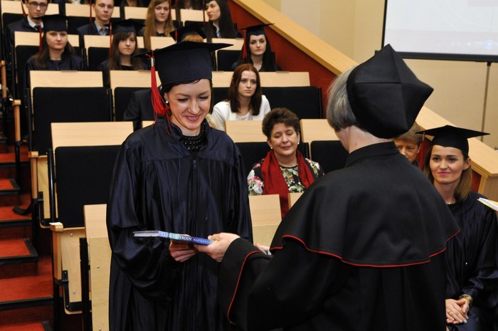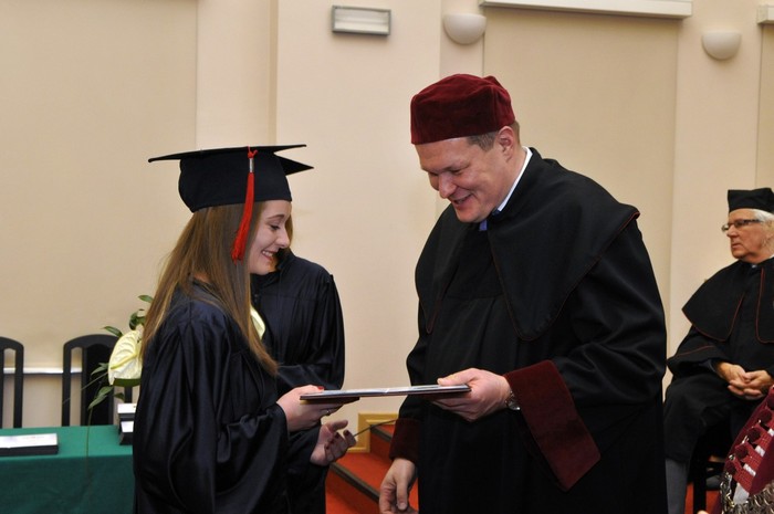 Absolwenci kierunku lekarsko-dentystycznego rocznika 2009-2014 i kierunku techniki dentystyczne rocznika 2011-2014 odebrali dyplomy 21 listopada br. z rąk prorektora ds. studenckich prof. Marcina Gruchały, dziekana Wydziału Lekarskiego prof. Marii Dudziak oraz prodziekana WL, kierownika Oddziału Stomatologicznego dr. hab. Marka Niedoszytko. Uroczystość odbyła się w Auditorium Primum im. Olgierda Narkiewicza w Atheneum Gedanense Novum. Dyplomy odebrało 55 absolwentów kierunku lekarsko-dentystycznego i 25 kierunku techniki dentystyczne. Przemówienia wygłosili prorektor prof. Marcin Gruchała, dziekan prof. Maria Dudziak, prodziekan dr hab. Marek Niedoszytko oraz zaproszeni honorowi goście: lek. dent. Halina Porębska, wiceprezes Okręgowej Rady Lekarskiej w Gdańsku, prof. Barbara Adamowicz-Klepalska, członek Rady Naukowej przy Ministrze Zdrowia, wieloletni kierownik Katedry i Zakładu Stomatologii Wieku Rozwojowego, prof. Maria Prośba-Mackiewicz, prezes Gdańskiego Oddziału PTS, wieloletni kierownik Zakładu Technik Dentystycznych i Zaburzeń Czynnościowych Narządu Żucia oraz prof. Zdzisław Bereznowski, wiceprezes Stowarzyszenia Absolwentów, kierownik Katedry i Zakładu Protetyki Stomatologicznej. Po uroczystym wręczeniu licznych nagród i listów gratulacyjnych dla wyróżnionych absolwentów głos zabrali: lek. dent. Agata Joniak, absolwentka kierunku lekarsko-dentystycznego oraz Paulina Wojtalik, przedstawiciel studentów V roku kierunku lekarsko-dentystycznego.