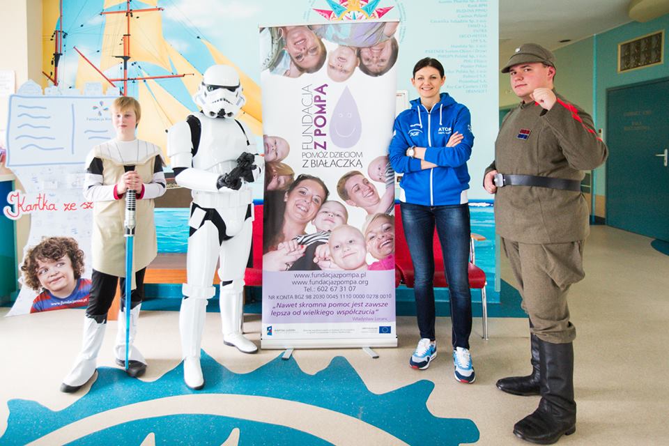 Siatkarka Atomu Trefl Sopot Milena Rosner oraz członkowie Polish Garrison Star Wars odwiedzili 22 listopada br. dzieci z Oddziału Hematologii UCK. Fundacja z Pompą – Pomóż Dzieciom z Białaczką przekazała nowy fotel zabiegowy, którego zakup był możliwy m.in. dzięki akcji siatkarek z Sopotu. Brakującą kwotę z własnych środków dołożyła Fundacja. Dodatkowo kupiła 200 wysokiej jakości korków do cewników centralnych.