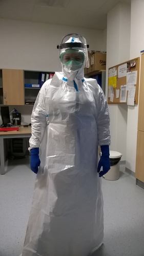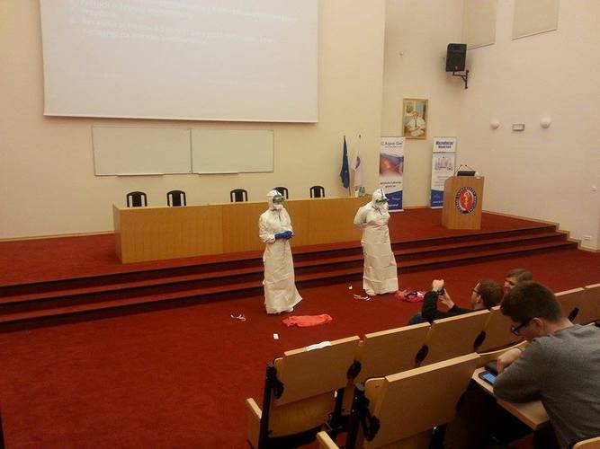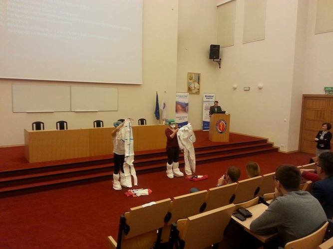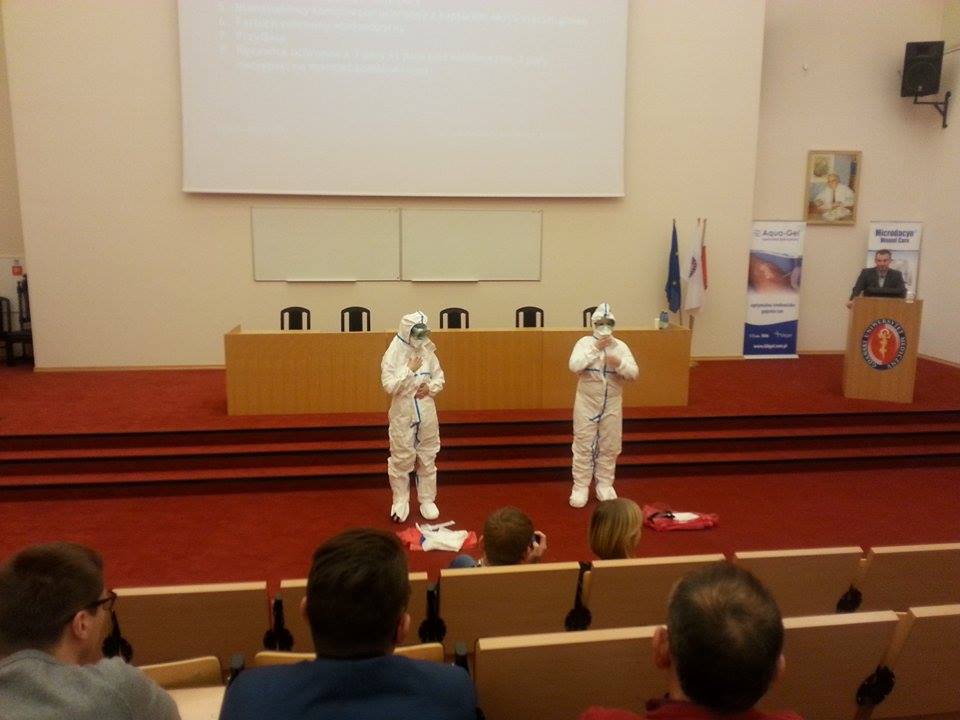 Uczestnicy spotkania mieli unikalną okazję poznania sposobu ubierania odzieży ochronnej PPE na wypadek kontaktu z osobą zarażoną wirusem. Prezentacji dokonały dwie studentki SKN. Liczny udział studentów i lekarzy pracujących w medycynie ratunkowej świadczy o znacznym zainteresowaniu środowiska akademickiego prezentowaną tematyką.