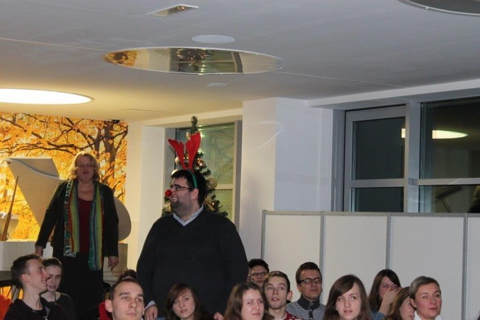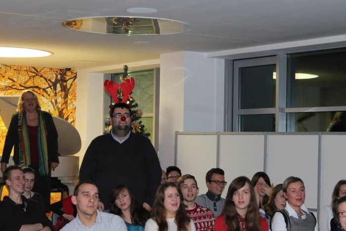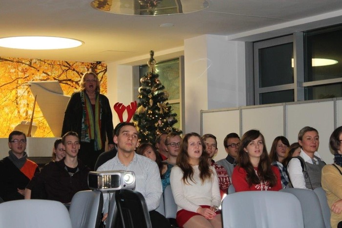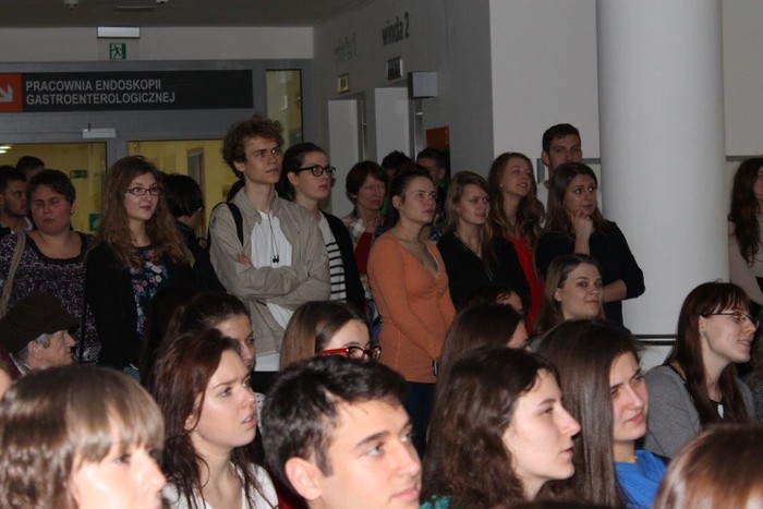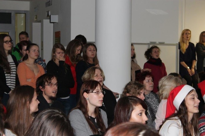 Już po raz drugi w Centrum Medycyny Inwazyjnej zabrzmiały angielskie kolędy i amerykańskie piosenki świąteczne. 18 grudnia 2014 r. na II piętrze CMI śpiewacy zgromadzili się wokół białego fortepianu, przy którym zasiadł Adam Niedorezo. Zaśpiewały m.in.: Katarzyna Ptaszyńska (II r. ratownictwo medyczne) i świeżo upieczona magister Sławka Misiewicz. Śpiewano też po niemiecku, francusku, hiszpańsku i po łacinie. To studenckie zaangażowanie z przyjemnością zauważyli goście honorowi – prof. Janusz Moryś, rektor GUMed, prof. Marcin Gruchała, prorektor ds. studenckich oraz mgr Ewa Książek-Bator, dyrektor UCK.