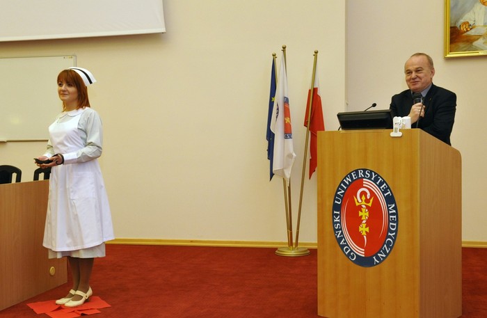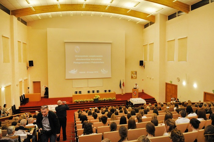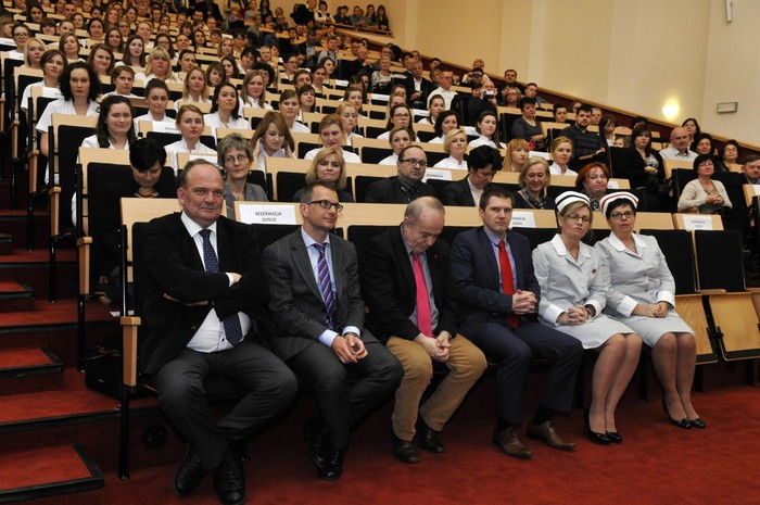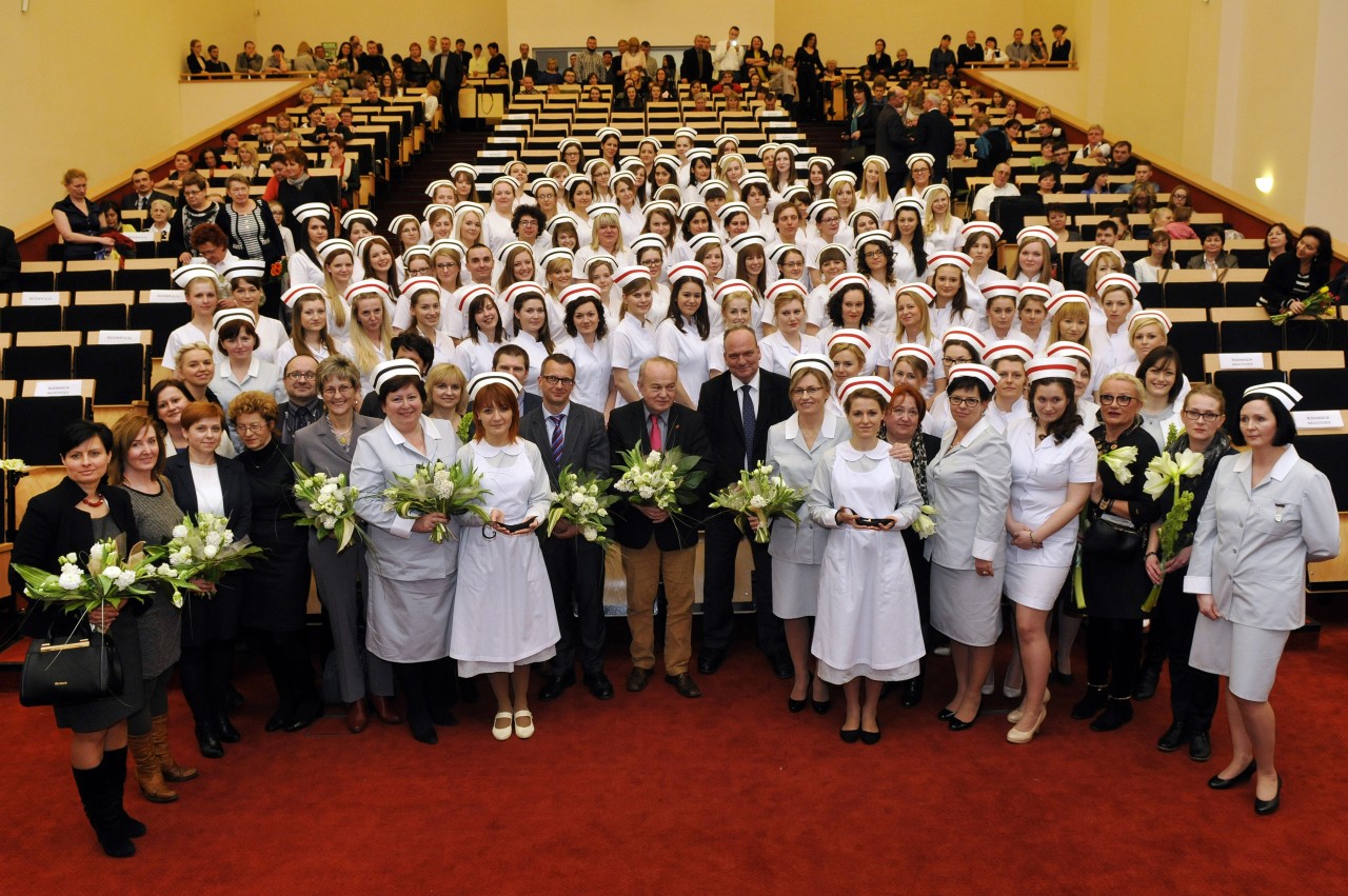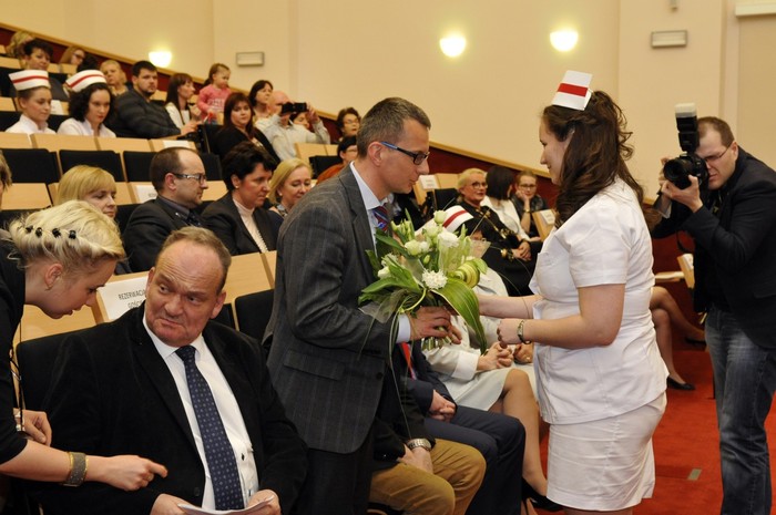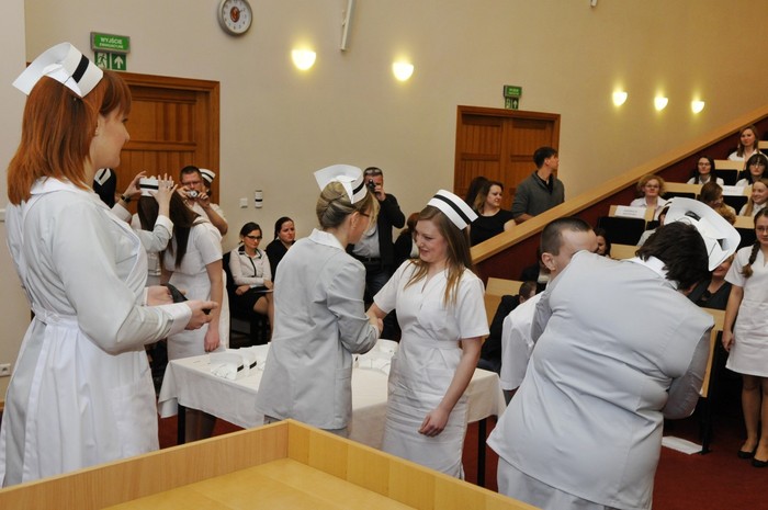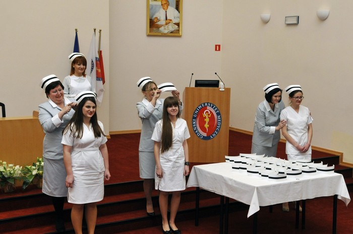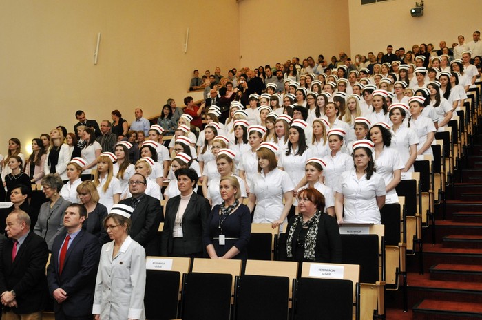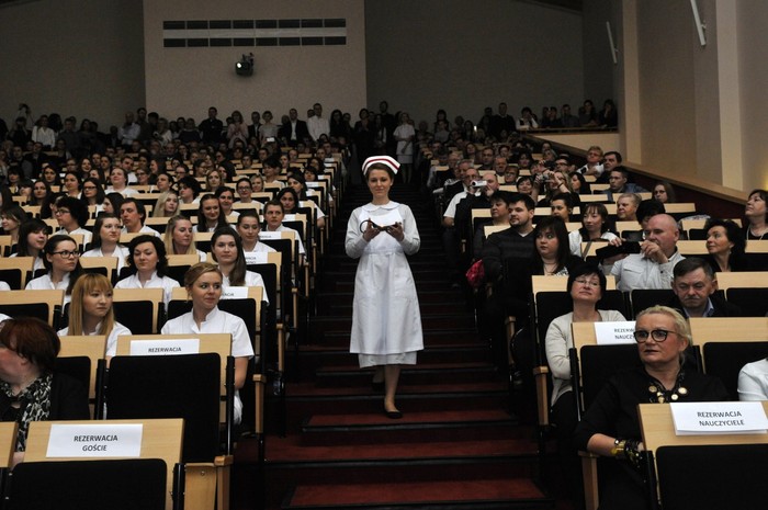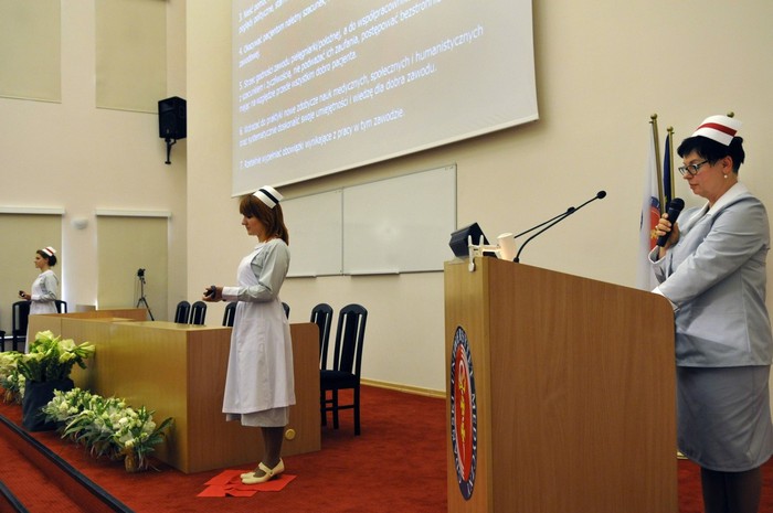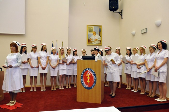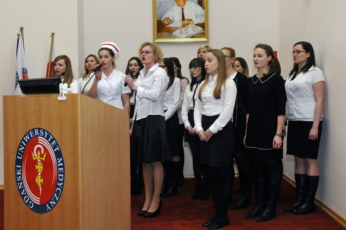 Uroczystość otworzyły studentki GUMed, ubrane w tradycyjne stroje, wprowadzając światło – symbol życia powierzanego ich opiece. Drugim symbolicznym elementem uroczystości było Przyrzeczenie, które stanowi wprowadzenie do Kodeksu Etyki Zawodowej Pielęgniarki i Położnej Rzeczpospolitej Polskiej. Studenci powtarzali słowa przysięgi ze wzruszeniem, przyjmując tym samym na swoje barki nadany tytuł zawodowy z “głębokim szacunkiem i czcią”. Uroczystość uświetniło odśpiewanie przez studentki III roku “Hymnu Pielęgniarskiego”. Wiele osób na sali nie potrafiło ukryć ogromnego wzruszenia, które wywołały poruszające słowa.