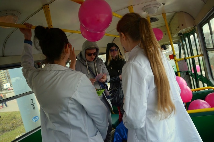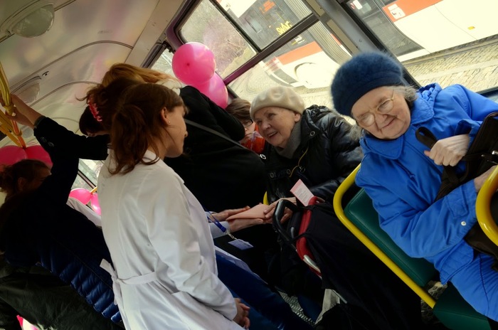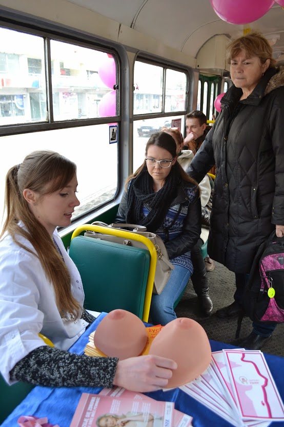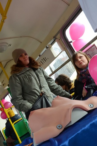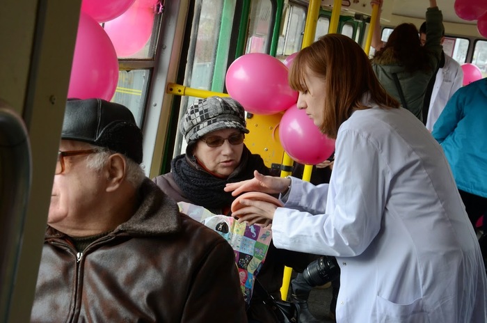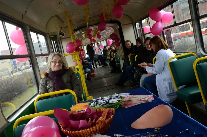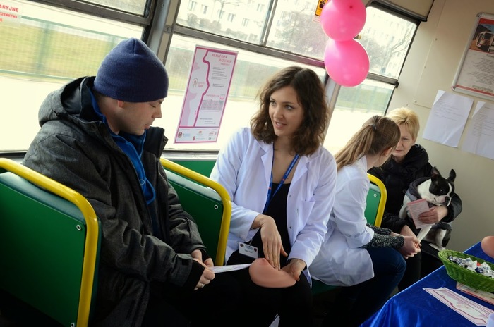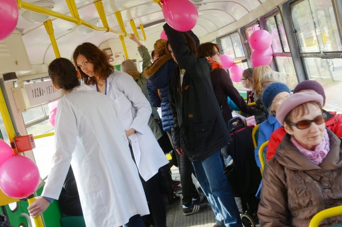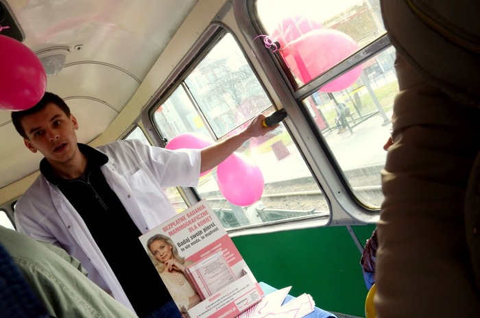 Członkowie Studenckiego Koła Naukowego przy Katedrze i Klinice Chirurgii Onkologicznej już po raz trzeci przeprowadzili akcję “Nie bądź gapa, skasuj raka!” w ramach projektu “Dotknij Piersi”. Wzięło w niej udział ok. 200 osób, które w minioną sobotę, 14 marca br. w godz. 11-14 wybrało się w bezpłatną podróż zabytkowym tramwajem. Mogli się tam nauczyć samobadania piersi na specjalnych fantomach, zdobyć informacje dotyczące raka piersi, badań przesiewowych oraz profilaktyki związanej z tą chorobą. Kobiety, mężczyźni, ale i dzieci byli zachwyceni akcją zorganizowaną przez studentów GUMed. Z wielką chęcią podchodzili do fantomów, na których starali się odnaleźć niepokojące zmiany. Niektórzy z nich byli już przeszkoleni na tym gruncie. W trakcie podróży wiele osób studiowało otrzymane ulotki oraz rozmawiało z organizatorami na tematy związane z onkologią.