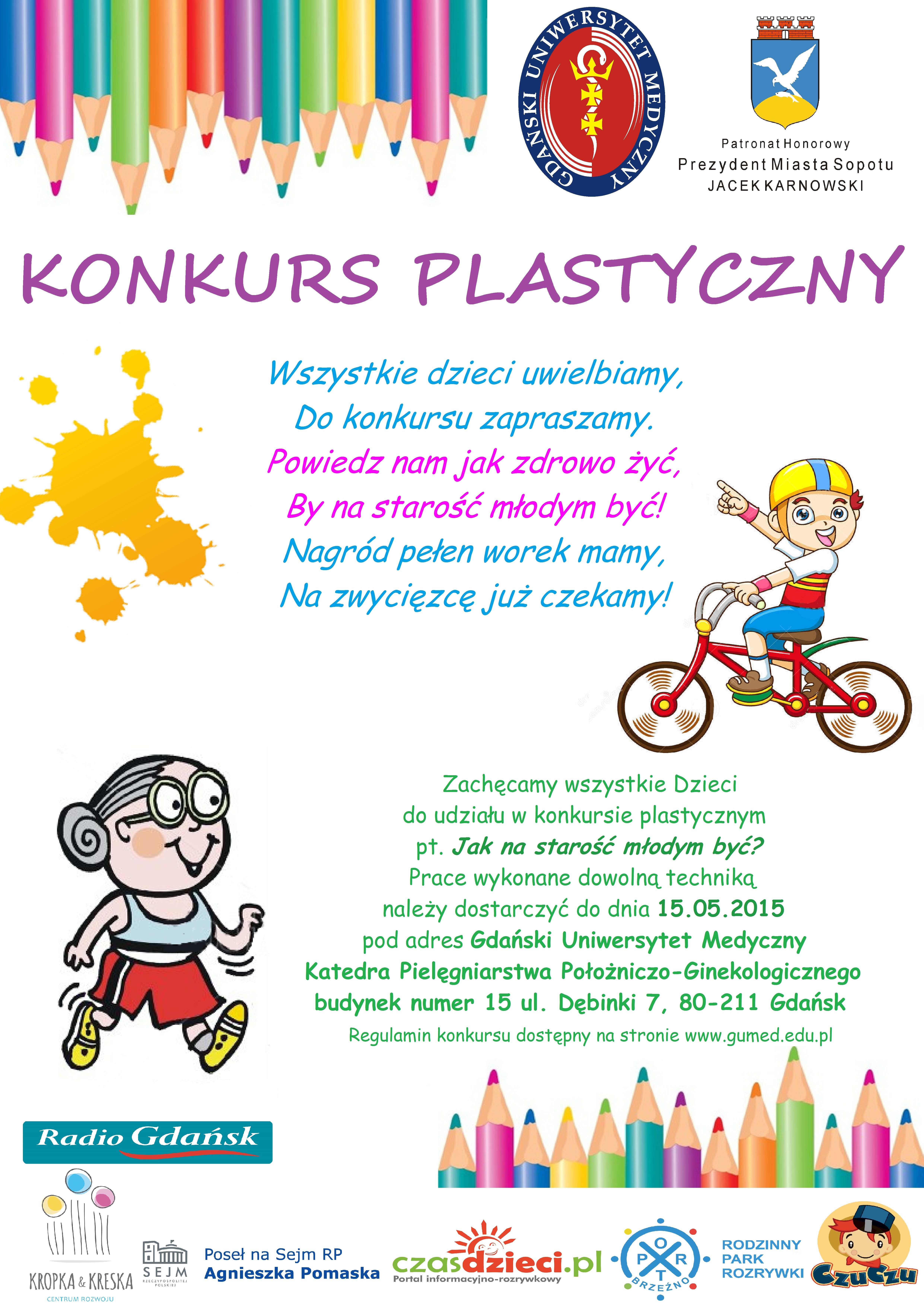 Gdański Uniwersytet Medyczny zaprasza wszystkie dzieci w wieku 6-12 lat do udziału w konkursie plastycznym Jak na starość młodym być. Prace wykonane dowolną techniką należy dostarczyć na adres: Gdański Uniwersytet Medyczny, budynek nr 15, ul. Dębinki 7, 80-211 Gdańsk do 15 maja br. z dopiskiem “Konkurs plastyczny”.