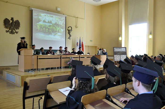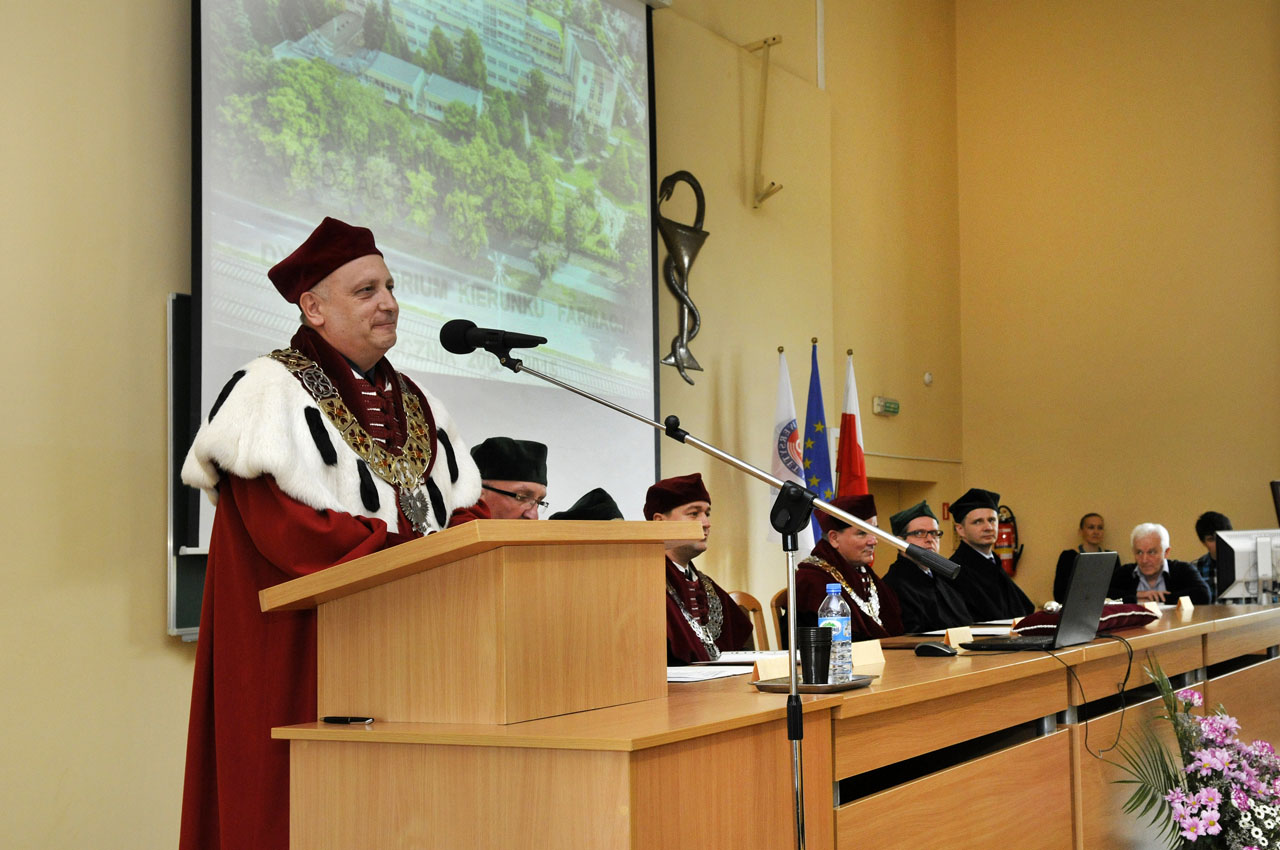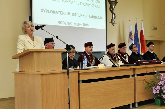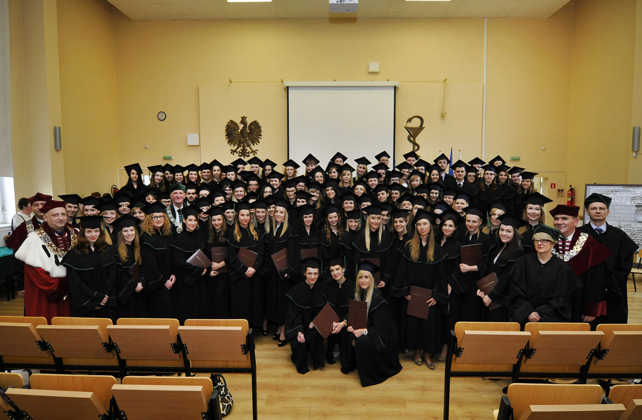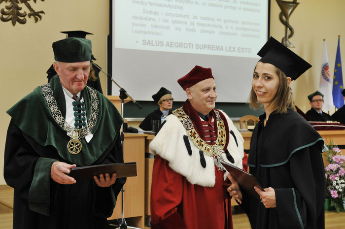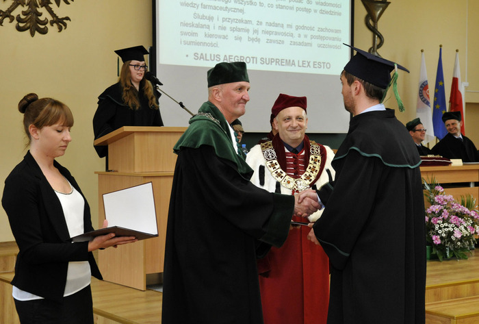Stu jedenastu magistrów farmacji rocznika 2009-2015 odebrało swoje dyplomy. Dyplomatorium odbyło się 22 maja br. w Auditorium Maximum Wydziału Farmaceutycznego z Oddziałem Medycyny Laboratoryjnej. W uroczystości, której przewodniczył dziekan Wydziału Farmaceutycznego z OML prof. Wiesław Sawicki, udział wzięli: rektor prof. Janusz Moryś, prorektor ds. nauki prof. Tomasz Bączek, prorektor ds. rozwoju i organizacji kształcenia prof. Leszek Bieniaszewski, prodziekani – prof. Michał Markuszewski, prof. Maciej Jankowski i dr hab. Anita Kornicka, członkowie Senatu, Rady Wydziału oraz zaproszeni goście i rodziny absolwentów.