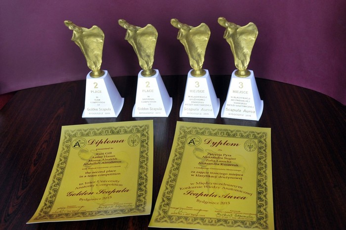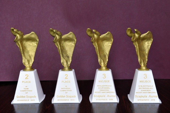 Po 8 latach przerwy studenci naszej Uczelni uczestniczyli w Międzyuczelnianym Konkursie Wiedzy Anatomicznej „Scapula Aurea”. Tegoroczna XXX edycja Konkursu odbyła się w Bydgoszczy. Do rywalizacji z przedstawicielami z 9 innych uczelni medycznych stanęła reprezentacja studentów I roku kierunku lekarskiego polskojęzycznego i po raz pierwszy w historii tego konkursu I roku kierunku lekarskiego anglojęzycznego (ED) pod opieką dr. Jana Spodnika. Był to bardzo udany powrót do konkursu, gdyż przedstawiciele GUMed-u zdobyli aż 4 nagrody. W kategorii studentów anglojęzycznych 2 miejsce zdobyła Rani Gill, zaś w kategorii studentów polskojęzycznych na 3 miejscu uplasowała się Patrycja Pyra. W kategorii zespołowej drużyna ED w składzie: Rani Gill, Aamir Hasan, Mousa Alnakhli i Abdullah Almahroos zdobyła miejsce 2, zaś drużyna polska w składzie: Patrycja Pyra, Aleksandra Sugier, Zofia Lasocka i Aleksandra Kuszczak – miejsce 3. W praktycznym przygotowaniu studentów dużą pomoc wykazało Koło Anatomiczne przy Zakładzie Anatomii i Neurobiologii.