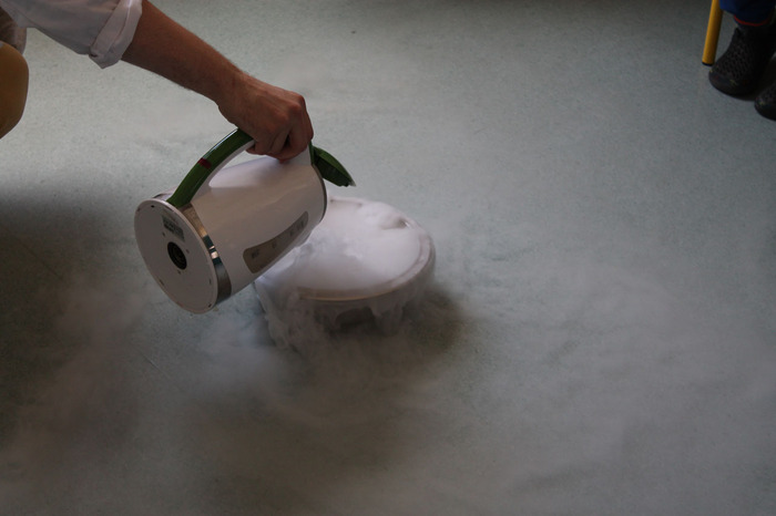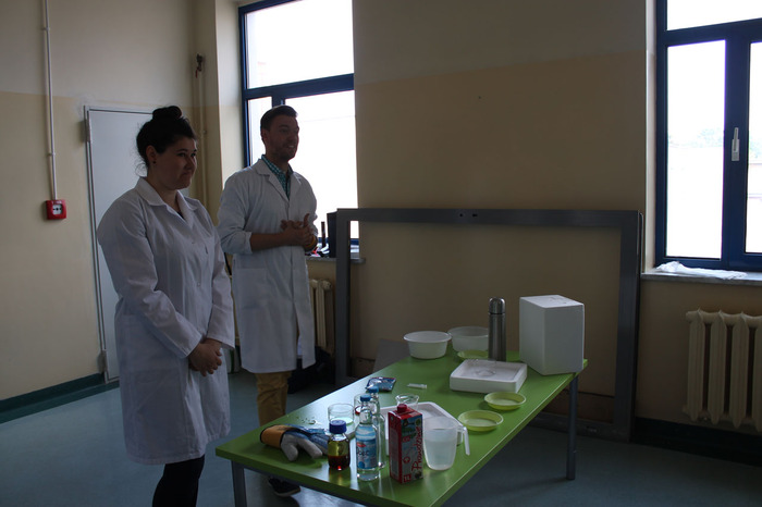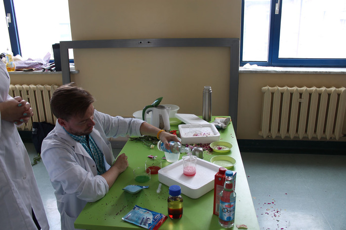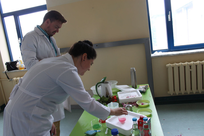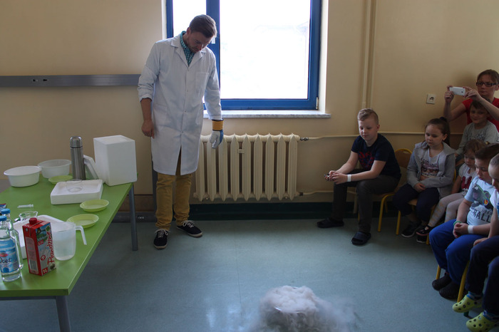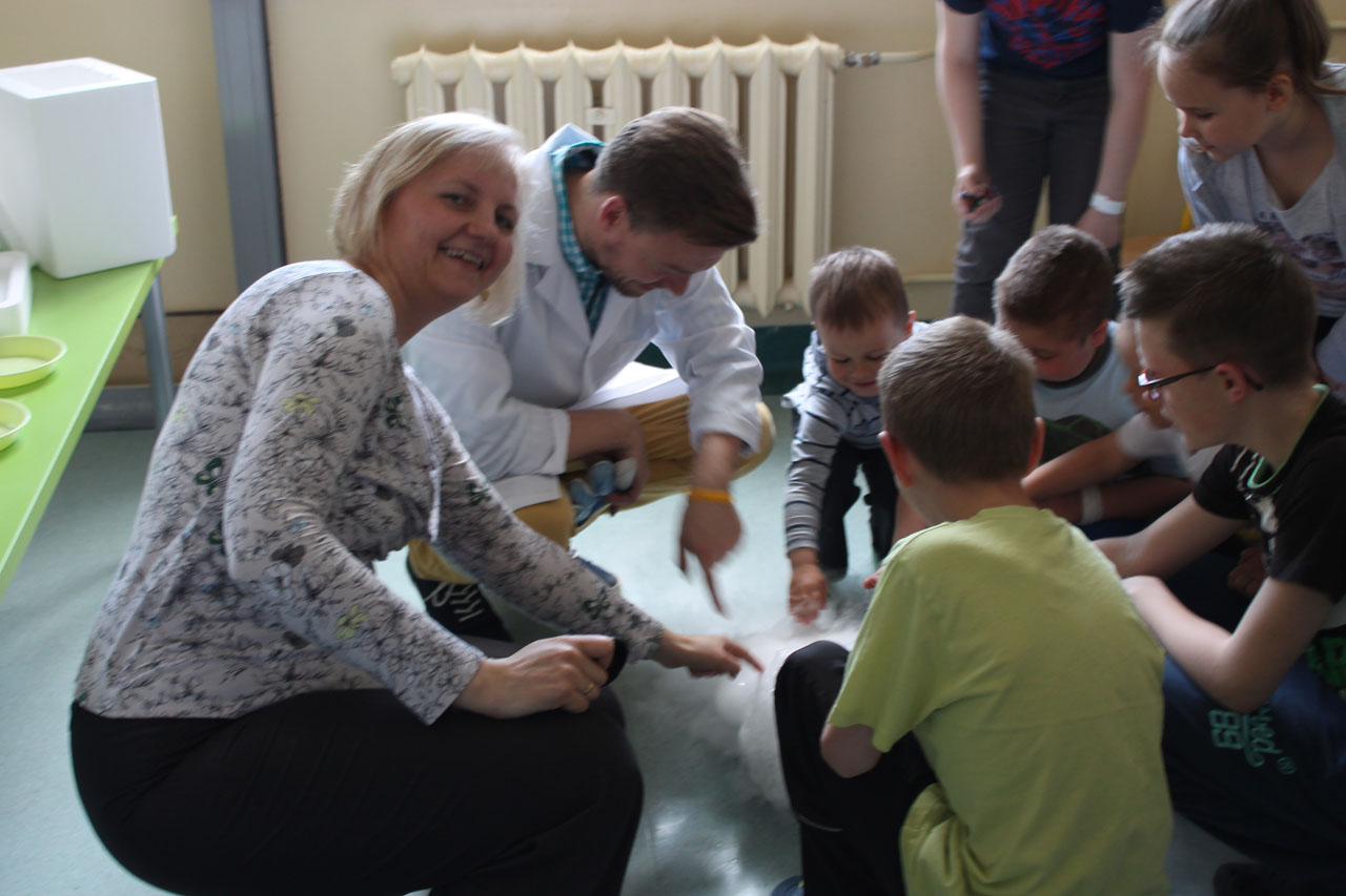 W trakcie zabawy mgr inż. Radosław Czernych z Dominiką Paprzycką pokazali dzieciom jak w sekundę można zamrozić kwiat róży w ciekłym azocie. Dzieci mogły dotknąć parującego i pachnącego cytryną i miętą grzybka wykonanego z baniek mydlanych i suchego lodu (niezbędnych materiałów użyczył lek. Adam Figarski z Katedry Chemii Medycznej) oraz sprawić, że barwy tańczyły na mleku.