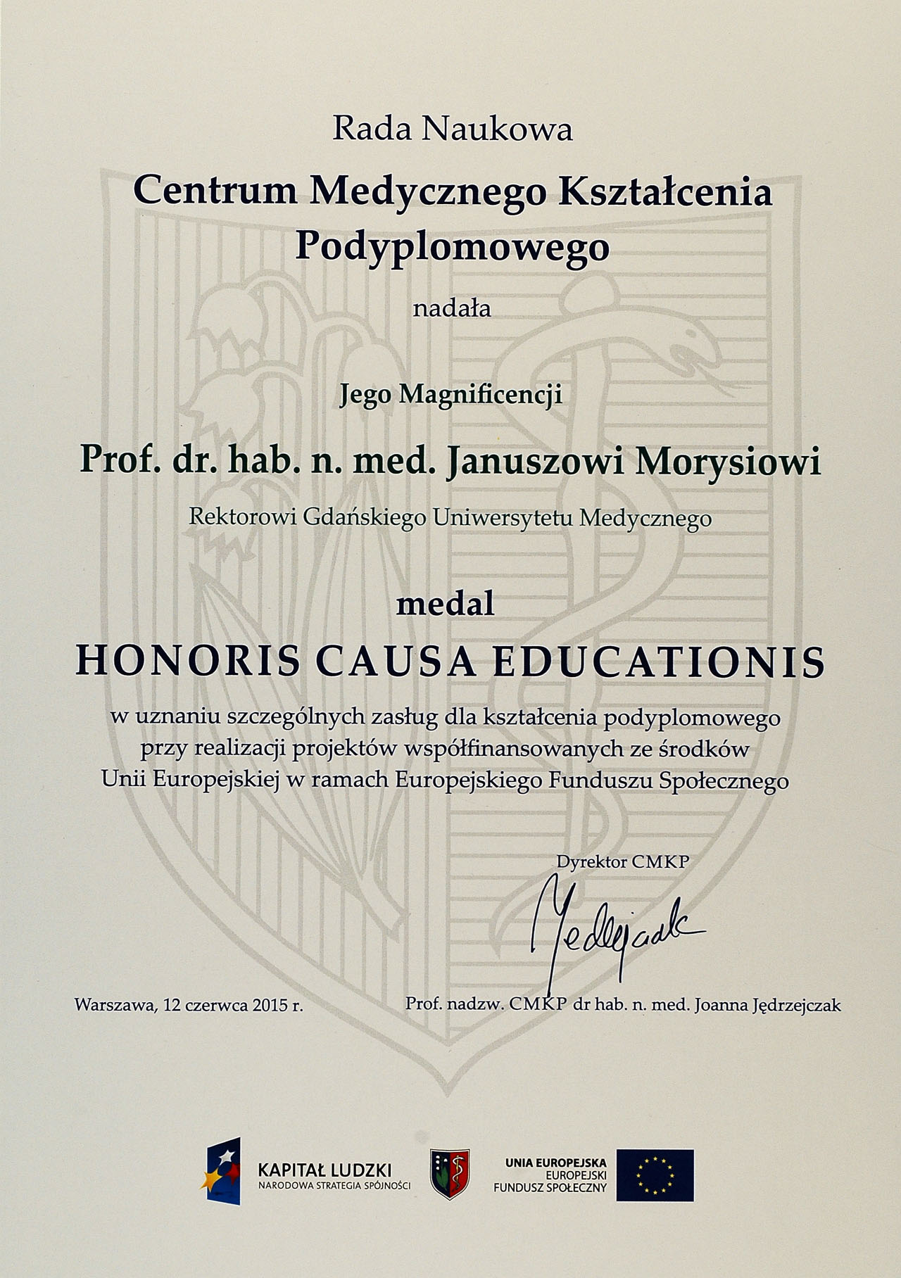 Rektor Gdańskiego Uniwersytetu Medycznego prof. Janusz Moryś otrzymał 12 czerwca br. medal Honoris Causa Educations. Rada Naukowa Centrum Medycznego Kształcenia Podyplomowego przyznała Rektorowi to wyróżnienie w uznaniu szczególnych zasług dla kształcenia podyplomowego przy realizacji projektów współfinansowanych ze środków Unii Europejskiej w ramach Europejskiego Funduszu Społecznego.