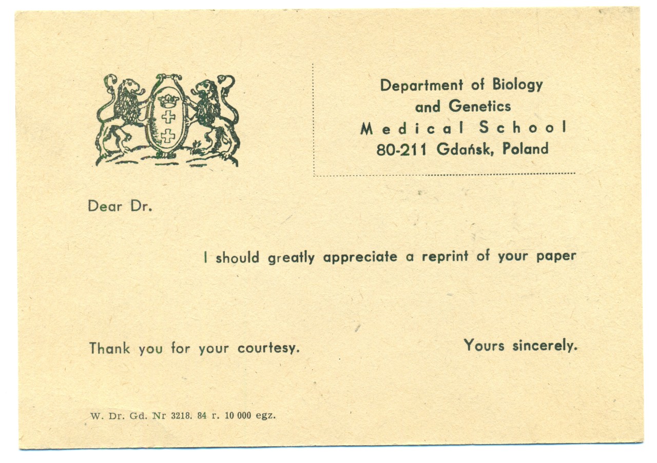 Inną metodą otrzymania interesującego artykułu była skierowana bezpośrednio do autora prośba o przesłanie kopii, ksera, odbitki konkretnego artykułu. Była to forma szeroko upowszechniona w świecie nauki. W naszym cyklu Tajemnice z muzealnej półki przedstawiamy dziś świadectwo minionych „wolniejszych” czasów, bez wszechobecnej technologii informatycznej. Dzięki uprzejmości Katedry i Zakładu Biologii i Genetyki kierowanej przez prof. Janusza Limona prezentujemy druk prośby o przesłanie odbitki pracy naukowej w formie karty pocztowej. Gotową kartę należało uzupełnić o nazwisko, adres autora i oczywiście tytuł artykułu. Następnie kartę wysyłano pocztą i uzbrajało się w cierpliwość czekając na odpowiedź i przesyłkę z daleka.