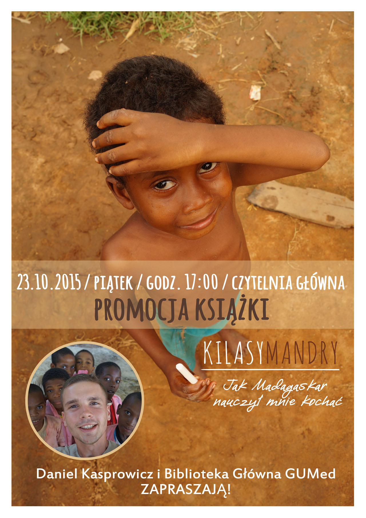 Chcesz poznać losy chłopaków z Domu Dziecka w malgaskim Mampikony? Dowiedzieć się czegoś na temat chorób tropikalnych czy problemu niedożywienia na Czarnym Lądzie? A może poznać młodego dietetyka, który ostatni rok spędził na Madagaskarze, gdzie opiekował się chorymi na tyfus, malarię i trąd? Zapraszamy na spotkanie z Danielem Kasprowiczem i promocję jego książki “Kilasymandry. Jak Madagaskar nauczył mnie kochać”, które odbędzie się 23 października o godz. 17 w Bibliotece Głównej GUMed. Chętni będą mogli zakupić egzemplarz z autorskim autografem i dedykacją, jak również wziąć udział w licytacji jednej z 12 unikatowych fotografii. Zysk ze sprzedaży książek i zdjęć zostanie przekazany na cele misyjne i potrzeby młodych wychowanków internatu w Mampikony.