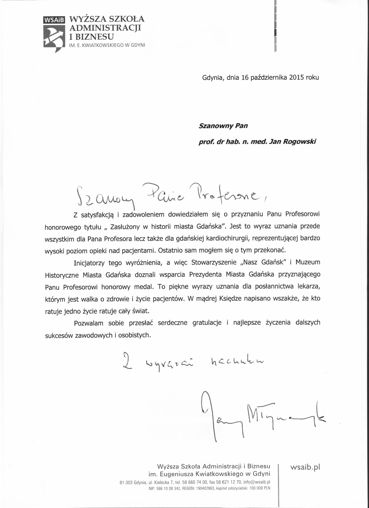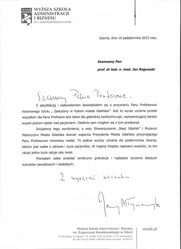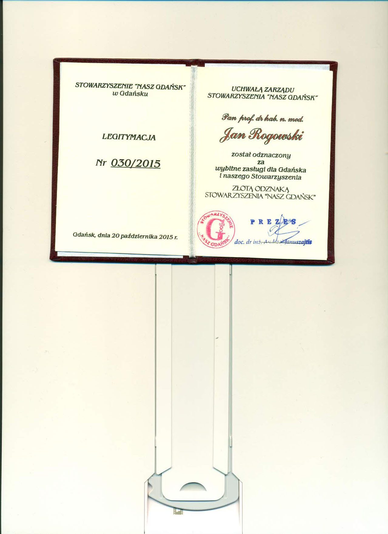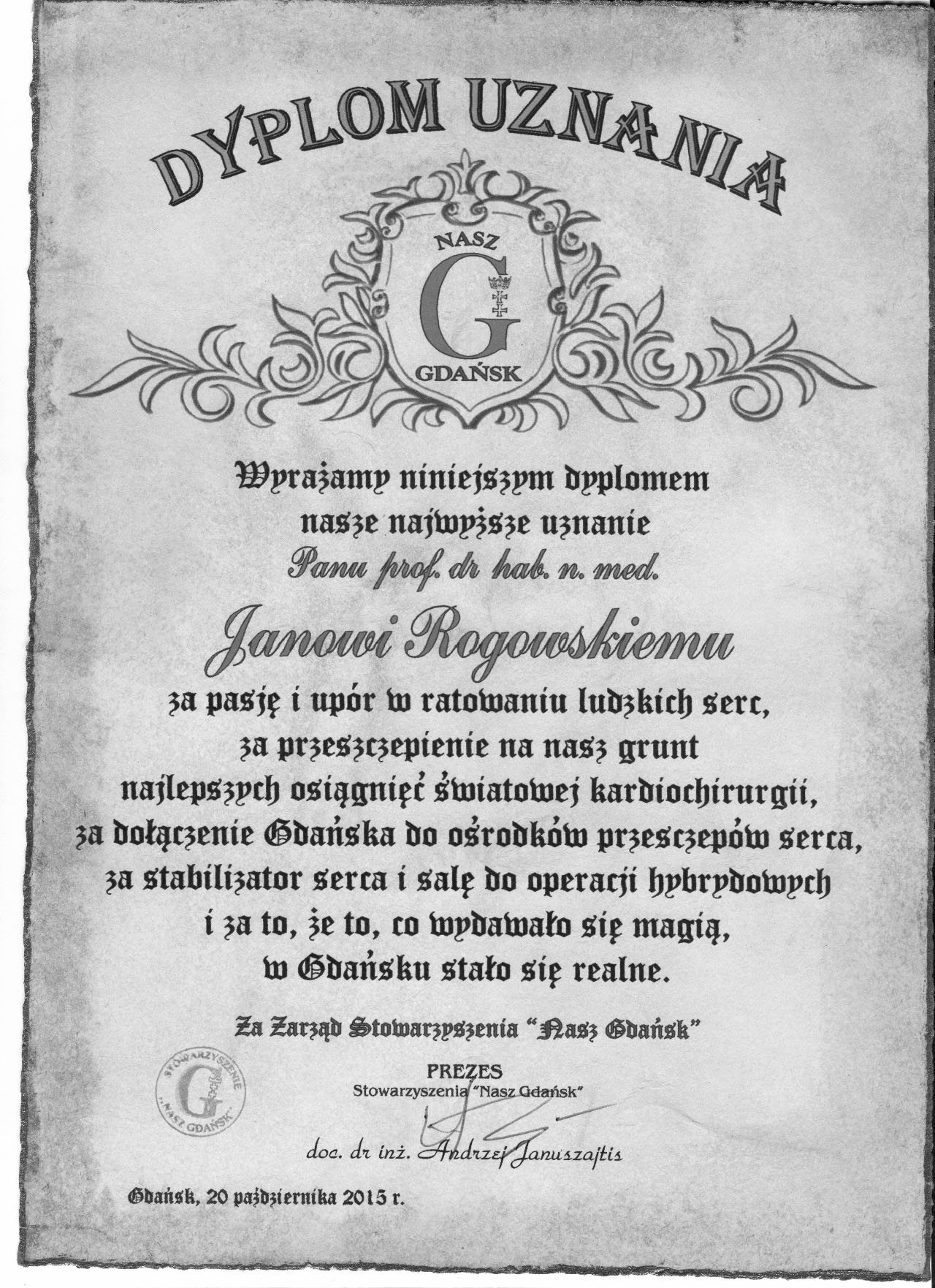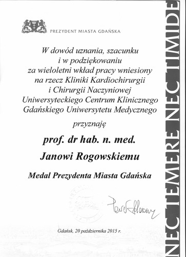 Prof. Jan Rogowski, kierownik Katedry i Kliniki Kardiochirurgii i Chirurgii Naczyniowej GUMed był gościem honorowym spotkania “Zasłużony w historii miasta Gdańska”, które odbyło się 20 października br. w Wielkiej Sali Wety Ratusza Głównego Miasta Gdańska. Podczas uroczystości prof. Jan Rogowski otrzymał odznaczenia nadane przez marszałka województwa pomorskiego Mieczysława Struka, prezydenta Gdańska Pawła Adamowicza, Stowarzyszenie “COR – Kardiochirurgia Gdańska”, Muzeum Historyczne Miasta Gdańska oraz Stowarzyszenie “Nasz Gdańsk”.