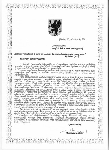 - Pana działalność jest doskonałym przykładem na to, że bycie lekarzem to więcej niż zawód. To powołanie do służby, do niesienia pomocy drugiemu człowiekowi. Jestem zaszczycona, że mogę wręczyć medal wybitnemu kardiochirurgowi, dzięki któremu Gdańsk stał się jedynym w całej Polsce północnej, wiodącym ośrodkiem przeszczepów serca – mówiła podczas wręczania odznaczenia Hanna Zych-Cisoń, członek zarządu województwa pomorskiego.