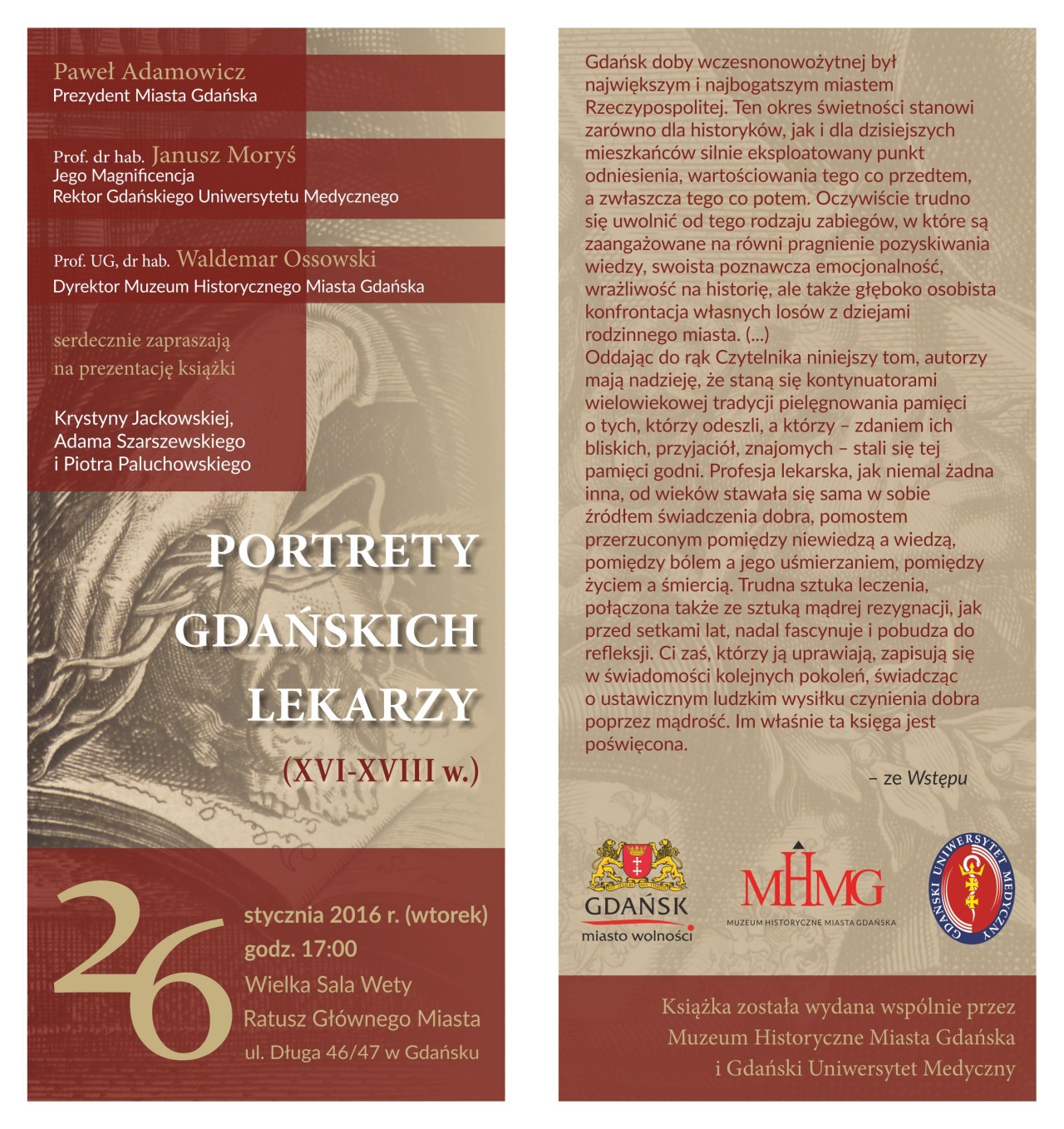 Gdański Uniwersytet Medyczny wraz z Muzeum Historycznym Miasta Gdańska przygotowuje promocję książki “Portrety gdańskich lekarzy (XVI-XVIII w.)”. Odbędzie się ona 26 stycznia o godz. 17 w Wielkiej Sali Wety Ratusza Głównego Miasta. Oddając do rąk Czytelnika publikację, autorzy mają nadzieję, że staną się kontynuatorami wielowiekowej tradycji pielęgnowania pamięci o tych, którzy odeszli, a którzy ‒ zdaniem ich bliskich, przyjaciół, znajomych ‒ stali się tej pamięci godni. Profesja lekarska, jak chyba żadna inna, od wieków stawała się źródłem świadczenia dobra, pomostem przerzuconym pomiędzy niewiedzą a wiedzą, pomiędzy bólem a jego uśmierzaniem, pomiędzy życiem a śmiercią. Trudna sztuka leczenia, połączona także ze sztuką mądrej rezygnacji, jak przed setkami lat, nadal fascynuje i pobudza do refleksji. Ci zaś, którzy ją uprawiają, zapisują się w świadomości kolejnych pokoleń, świadcząc o ustawicznym ludzkim wysiłku czynienia dobra poprzez mądrość. Im właśnie jest poświęcona ta księga.