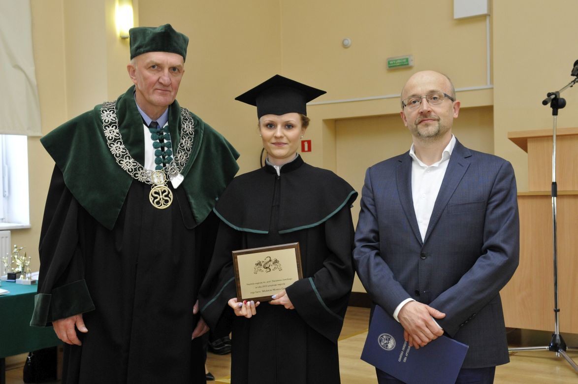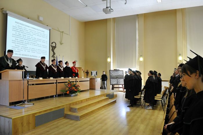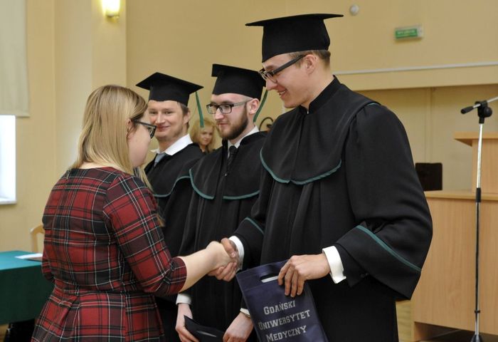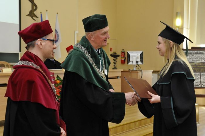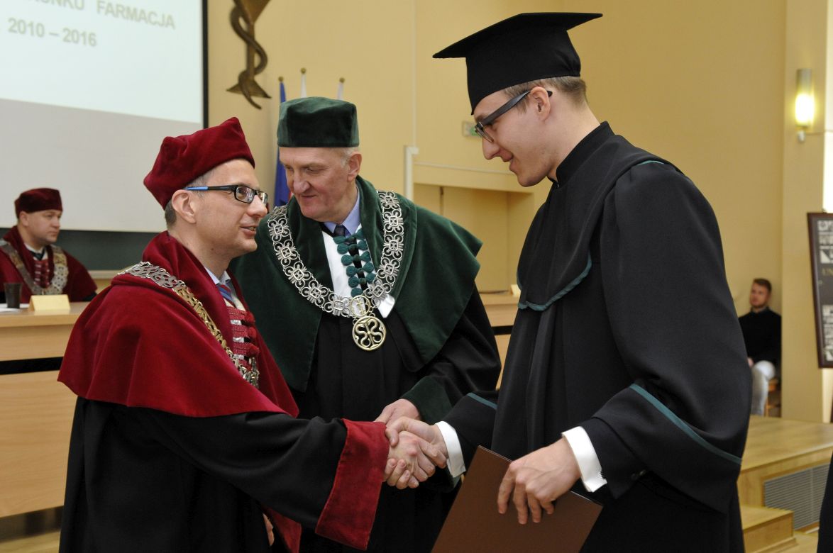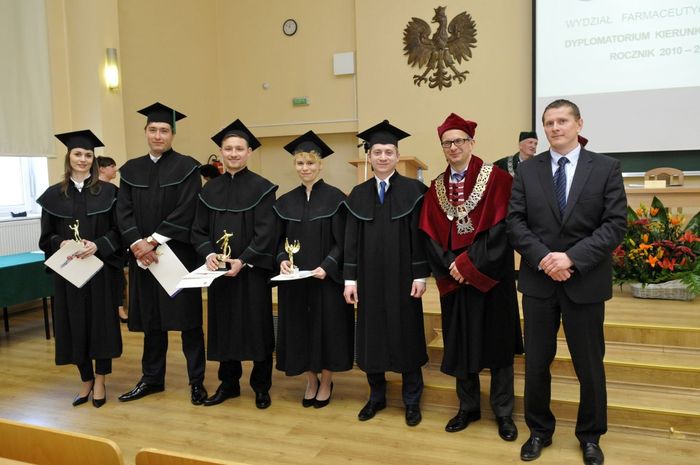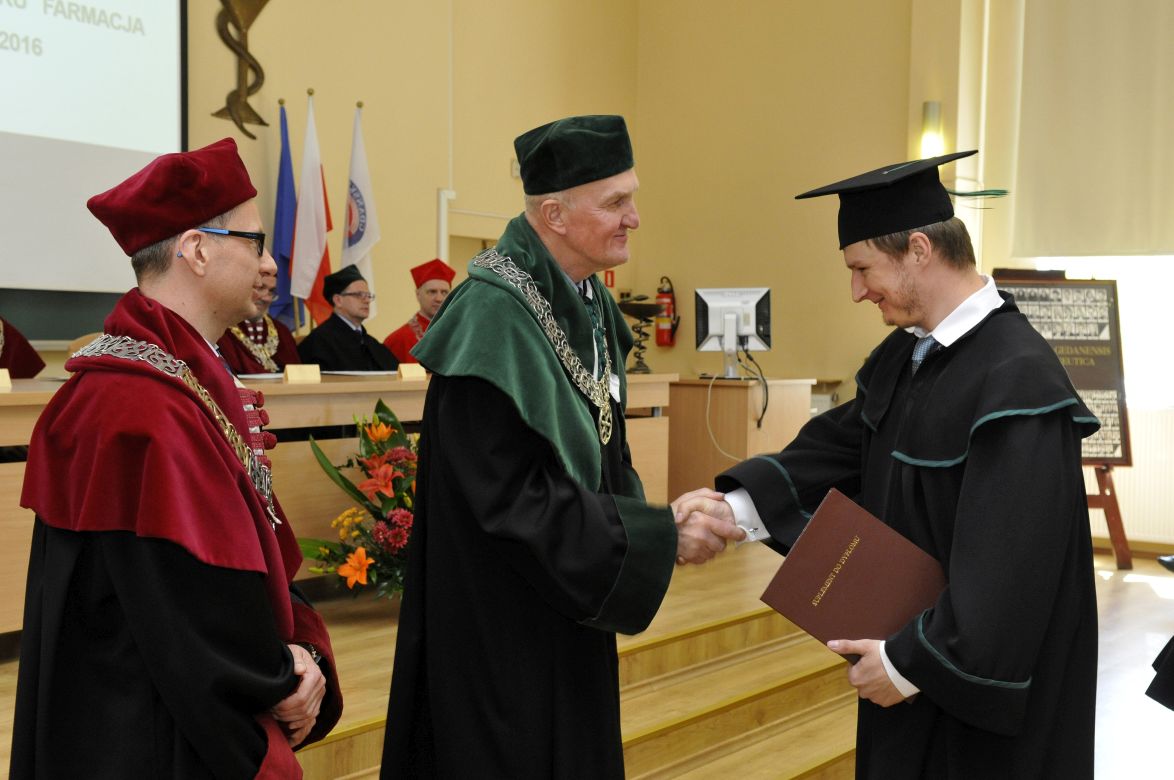Po złożeniu przyrzeczenia absolwenci odebrali dyplomy z rąk rektora elekta prof. Marcina Gruchały i dziekana prof. Wiesława Sawickiego. Wyróżniającym się absolwentom wręczono listy gratulacyjne i nagrody książkowe ufundowane przez Gdańską Okręgową Izbę Aptekarską. Za wyniki w nauce nagrodzono: Wiolettę Gancarz, Aleksandrę Grabowską, Izę Szarłowską i Dorotę Marcinkiewicz. Za działalność na rzecz społeczności akademickiej wyróżnieni zostali: Bartosz Petrykowski, Anna Twarogowska, Anna Sosnowicz-Pytel i Wojciech Gostomczyk. Ponadto Anna Twarogowska i Wojciech Gostomczyk otrzymali nagrody Rektora za pełnienie z wielkim zaangażowaniem wielu funkcji w organach Uczelni i strukturach Uczelnianego Samorządu Studenckiego. Z kolei Wioletta Gancarz odebrała nagrodę im. prof. Stanisława Janickiego, ufundowaną przez Gdańską Okręgową Izbę Aptekarską. Wręczył ją prezes GOIA dr Paweł Chrzan.