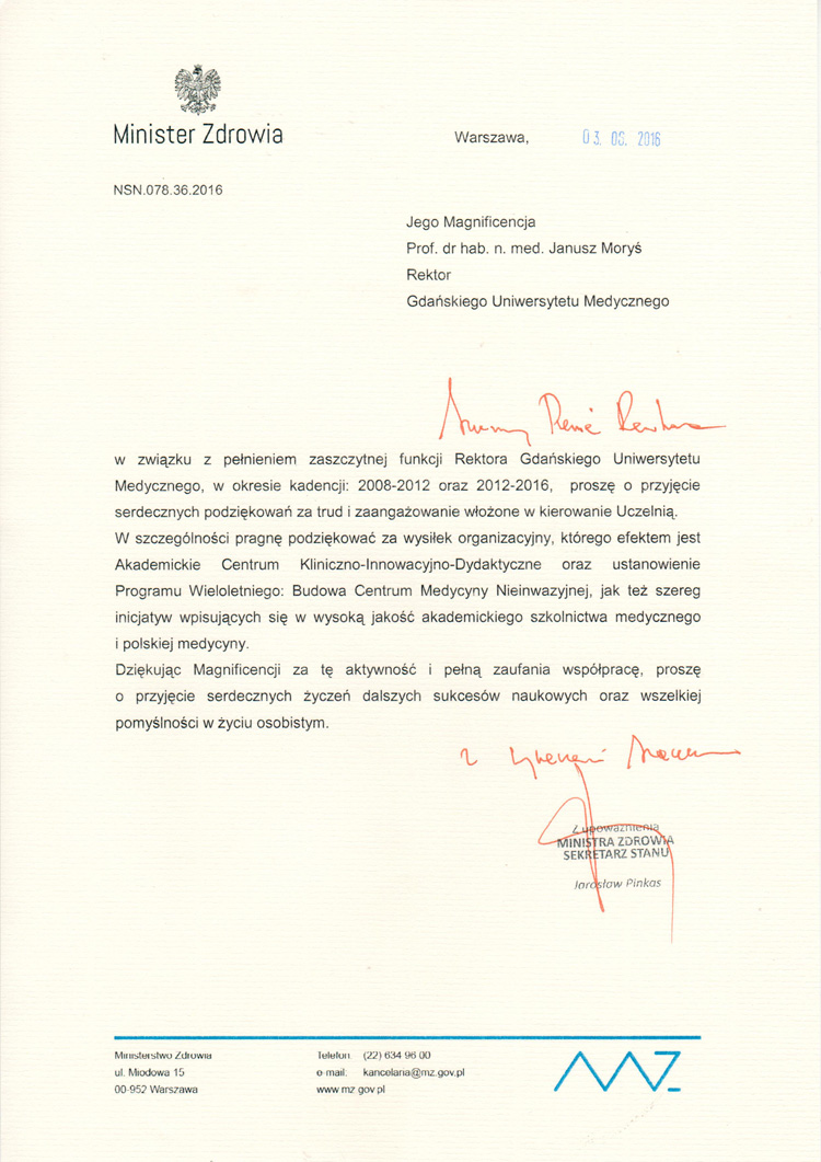 Podsekretarz Stanu Ministerstwa Zdrowia Jarosław Pinkas osobiście wręczył rektorowi GUMed prof. Januszowi Morysiowi podziękowania za trud i zaangażowanie włożone w kierowanie Gdańskim Uniwersytetem Medycznym przez dwie kadencje. Uroczystość odbyła się podczas posiedzenia Konferencji Rektorów Akademickich Uczelni Medycznych 3 czerwca br. w Sopocie.