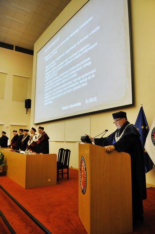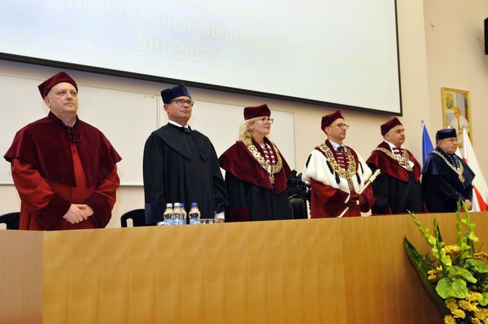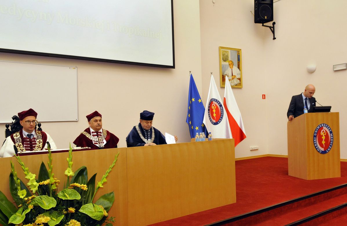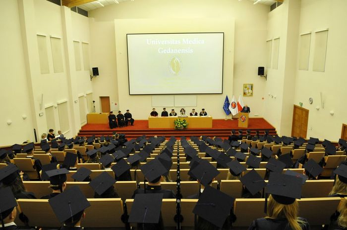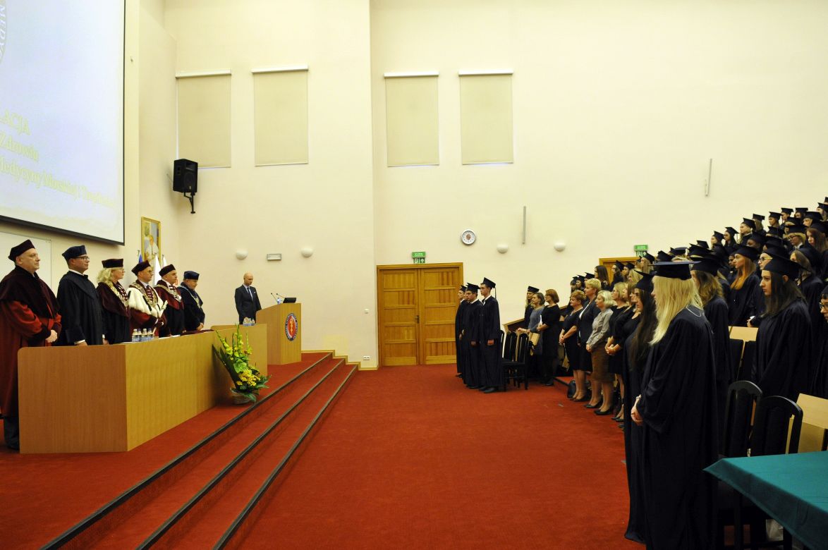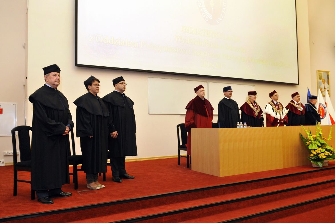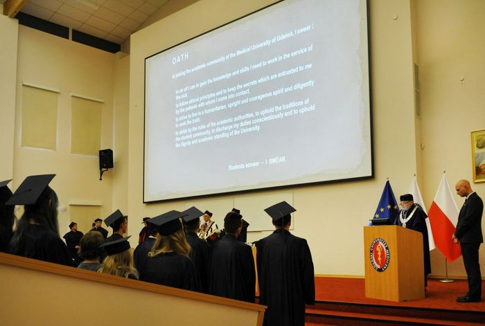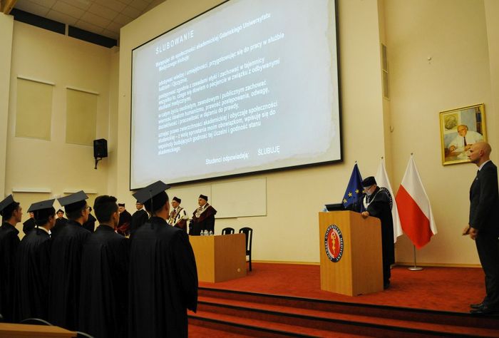 Uroczysta immatrykulacja na Wydziale Nauk o Zdrowiu odbyła się 29 września br. w Atheneum Gedanense Novum. Naukę na 9 kierunkach studiów rozpoczęło ponad 600 studentów, w tym 13 obcokrajowców. Uroczystość zaszczycili obecnością rektor prof. M. Gruchała i prof. J. Moryś, rektor kadencji 2008-2016. W immatrykulacji udział wzięli także prorektor ds. klinicznych prof. E. Szurowska, prorektor ds. studenckich dr hab. Tomasz Smiatacz, członkowie Rady Wydziału WNoZ, zaproszeni goście, opiekunowie roku, kierownicy kierunków oraz pracownicy Dziekanatu. Po odśpiewaniu hymnu państwowego głos zabrał rektor Gruchała. Serdecznie powitał wszystkich studentów, ze szczególnym uwzględnieniem rozpoczynających w tym roku po raz pierwszy naukę na anglojęzycznym pielęgniarstwie. Dziekan WNoZ prof. A. Basiński przyjął ślubowanie studentów zarówno w języku polskim, jak i angielskim. Po raz pierwszy ślubowanie składali studenci nowego kierunku – psychologii zdrowia. Następnie Rektor wraz z Dziekanem wręczyli listy gratulacyjne studentom z najlepszym wynikiem rekrutacyjnym na poszczególnych kierunkach. Uroczystość prowadził dr Daniel Ślęzak z Katedry i Kliniki Medycyny Ratunkowej.