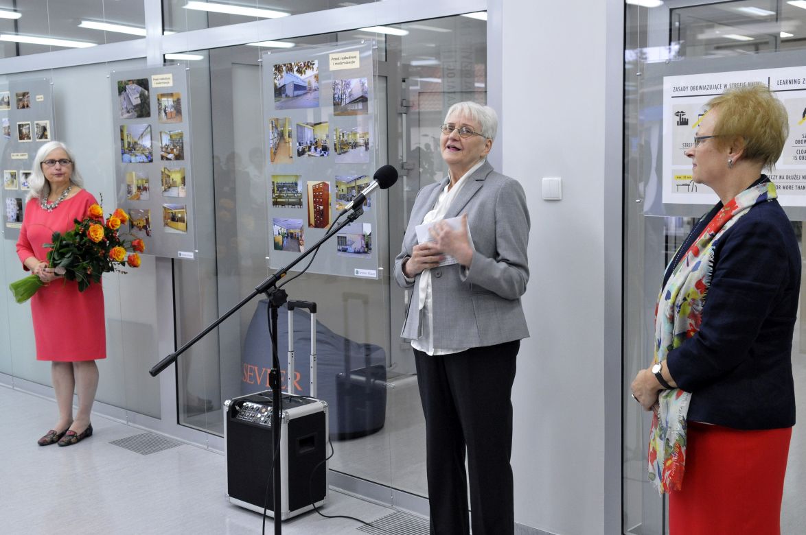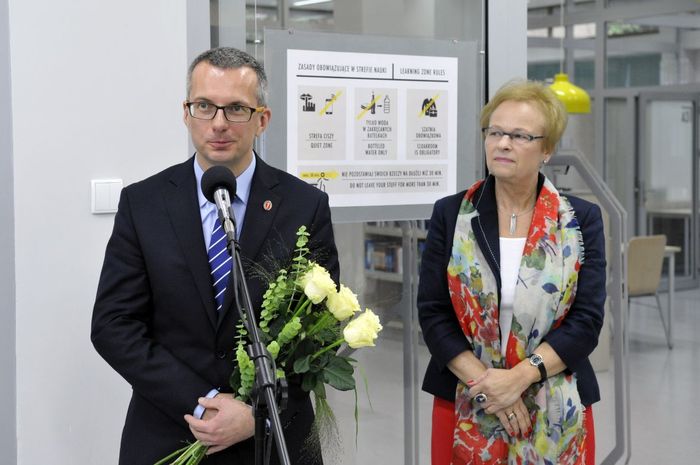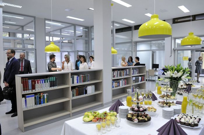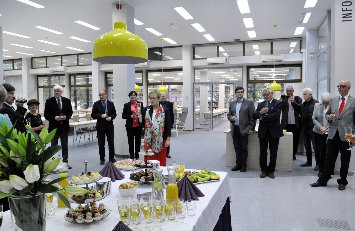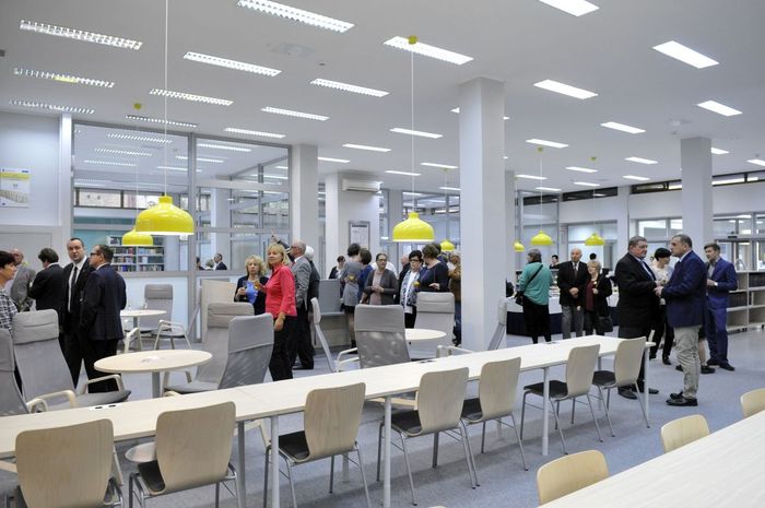 Lekka konstrukcja dobudowanej Czytelni, zastosowanie szklanych ścian zewnętrznych i wewnętrznych ścianek działowych na poziomie parteru budynku, a także spokojna i nowoczesna kolorystyka wnętrza sprawia, iż przestrzeń dostępna dla użytkowników stała się otwarta i zapraszająca do środka, sprzyjając skupieniu i nauce. Zlokalizowana w holu wejściowym Wypożyczalnia jest łatwiej dostępna i nie koliduje z ciszą obowiązującą w Strefie Nauki. Zamiast tradycyjnej szatni zorganizowano szatnię bezobsługową z szafkami, powstał także nowy węzeł sanitarny odpowiadający potrzebom masowo odwiedzających Bibliotekę użytkowników.
