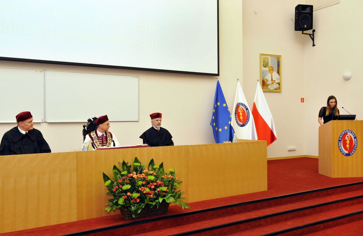 Absolwenci Oddziału Stomatologicznego kierunku lekarsko-dentystycznego rocznika 2011-2016 oraz kierunku techniki dentystyczne rocznika 2013-2016 zakończyli oficjalnie swoje studia. Dyplomatorium odbyło się 18 listopada 2016 r. w Atheneum Gedanense Novum. Przemówienia wygłosili m.in.: rektor GUMed prof. Marcin Gruchała i prodziekan WL, kierownik Oddziału Stomatologicznego prof. Marek Niedoszytko, wiceprezes Okręgowej Rady Lekarskiej w Gdańsku lek. dent. Anna Śpiałek, wiceprezes Gdańskiego Oddziału PTS, kierownik Katedry i Zakładu Periodontologii i Chorób Błony Śluzowej Jamy Ustnej dr hab. Aida Kusiak, prof. nadzw., wiceprezes Stowarzyszenia Absolwentów, kierownik Katedry i Zakładu Protetyki Stomatologicznej dr hab. Zdzisław Bereznowski, prof. nadzw. oraz wieloletni opiekun studentów WL i OS dr Henryk Zawadzki. Po uroczystym wręczeniu licznych nagród i listów gratulacyjnych dla wyróżnionych absolwentów głos zabrali: Dorota Ogonowska, przedstawiciel studentów V roku kierunku lek-dent. oraz Camilla Majewska i Grzegorz Gawin, absolwenci kierunku lekarsko-dentystycznego. Dyplomy odebrało 82 absolwentów.