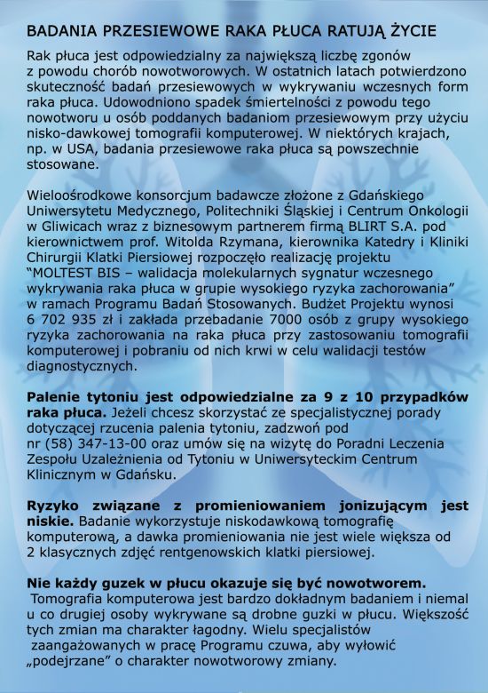 W Gdańskim Uniwersytecie Medycznym trwa projekt „MOLTEST BIS – walidacja molekularnych sygnatur wczesnego wykrywania raka płuca w grupie wysokiego ryzyka zachorowania”. Jest on konsekwencją projektów: „Pomorski Pilotażowy Program Badań Wczesnego Wykrywania Raka Płuca” i „Opracowanie molekularnych testów wspomagających wykrywanie wczesnego raka płuca MOLTEST 2013”. Wykonano w nich badanie niskodawkowej tomografii komputerowej (NDTK) u 8600 osób z grupy wysokiego ryzyka zachorowania na raka płuca, a następnie przeprowadzono badania molekularne w celu wykrycia sygnatury wczesnego raka płuca. Na ich podstawie opracowano 4 sygnatury molekularne oparte o wybrane białka, krążące miRNA i profil masowy peptydomu surowicy; sygnatury te poddano procesowi patentowemu. Charakteryzują się one ponad 90% czułością i ponad 30% swoistością, co znacząco przewyższa dokładność diagnostyczną NDTK. Obecnie planowane jest przeprowadzenie oceny wartości diagnostycznej tych sygnatur na niezależnej grupie osób wysokiego ryzyka raka płuca. Przebadanych zostanie 7000 osób przy zastosowaniu NDTK, od których zostanie pobrana krew i przeprowadzone zostanie molekularne badanie walidacyjne. Wyniki takiego badania umożliwią komercjalizację otrzymanych sygnatur i przygotowanie testu diagnostycznego.