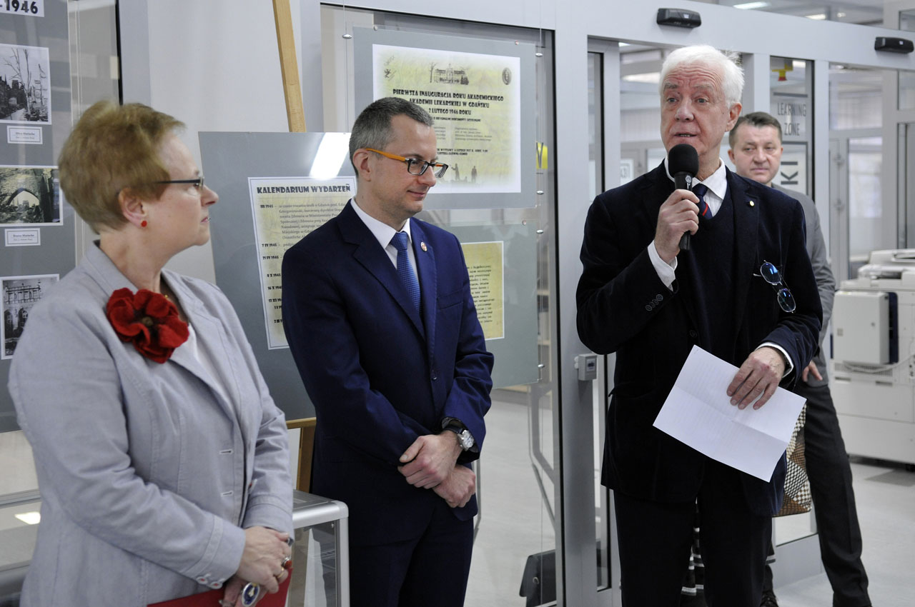 Oryginalne dokumenty, unikatowe zdjęcia czy tekst ślubowania studentów pierwszego roku – to tylko niektóre z eksponatów wystawy upamiętniającej pierwszą inaugurację roku akademickiego ówczesnej Akademii Lekarskiej w Gdańsku. Uroczysta otwarcie ekspozycji odbyło się 6 lutego br. w murach Biblioteki Głównej GUMed. Zgromadzonych gości powitała mgr Anna Grygorowicz, dyrektor Biblioteki razem z rektorem prof. Marcinem Gruchałą, który wystawę objął honorowym patronatem i prof. Januszem Limonem, jednym z organizatorów tego wydarzenia.