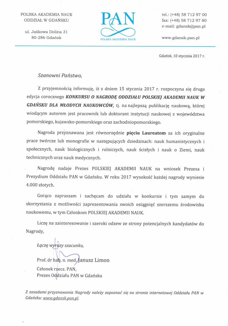 Wyniki konkursu zostaną ogłoszone w maju lub czerwcu. Wysokość nagrody to 4 tys. zł. Więcej na www.gdansk.pan.pl, tel. 58 712 97 02, e-mail gdansk@pan.pl.