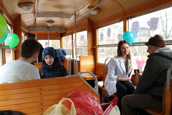 Już tradycyjnie z okazji Dnia Dentysty członkowie PTSS Gdańsk i SKN Stomatologii Zachowawczej GUMed przy wsparciu finansowym Uczelnianego Samorządu Studenckiego przeprowadzili akcję profilaktyczną w zabytkowym tramwaju. Podróż za jeden uśmiech odbyła się 4 marca br. na trasie Brzeźno – PKM Strzyża. Mieszkańcy Gdańska chętnie wsiadali do zabytkowego pojazdu by wysłuchać wielu cennych rad i wskazówek dotyczących higieny jamy ustnej.