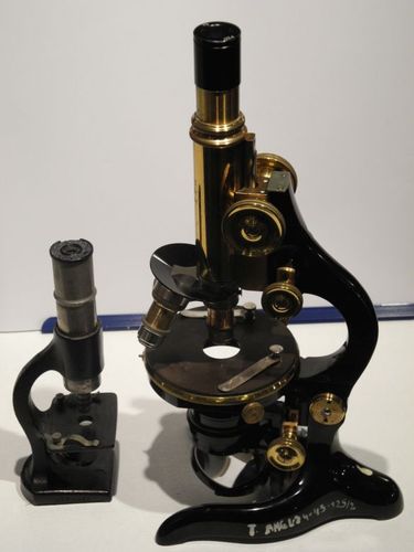 Następna fotografia uwidacznia różnicę wielkości tego mikroskopu w stosunku do typowego urządzenia, również z kolekcji Muzeum GUMed. Nie należy dać zwieść się niepozornemu wyglądowi, zapewnienie odpowiedniego światła pozwala na swobodne mikroskopowanie preparatów, szczególnie w zakresie wymaganym przez studenta medycyny lub pasjonata biologii pragnącego zgłębiać tajemnice mikroświata.