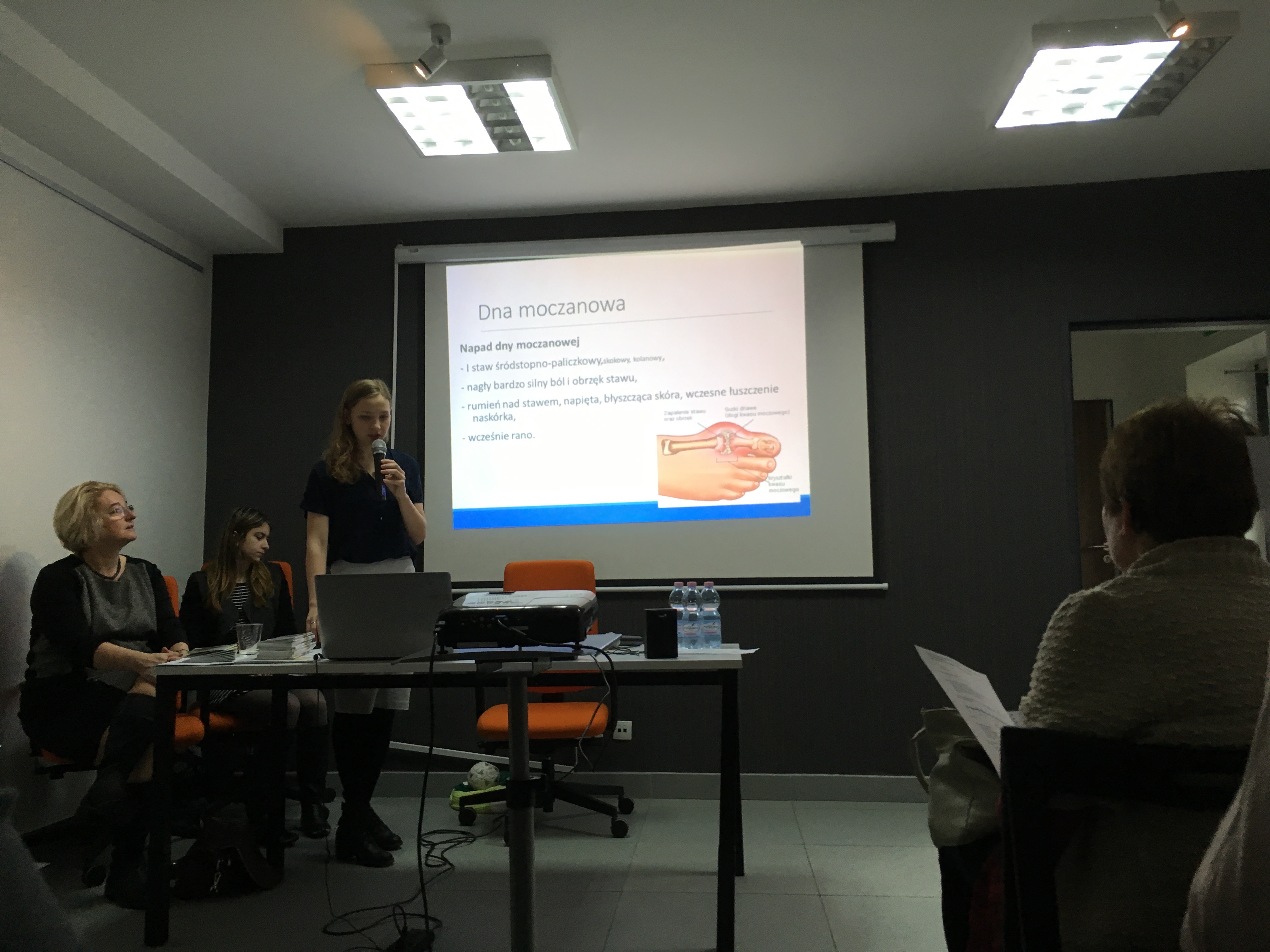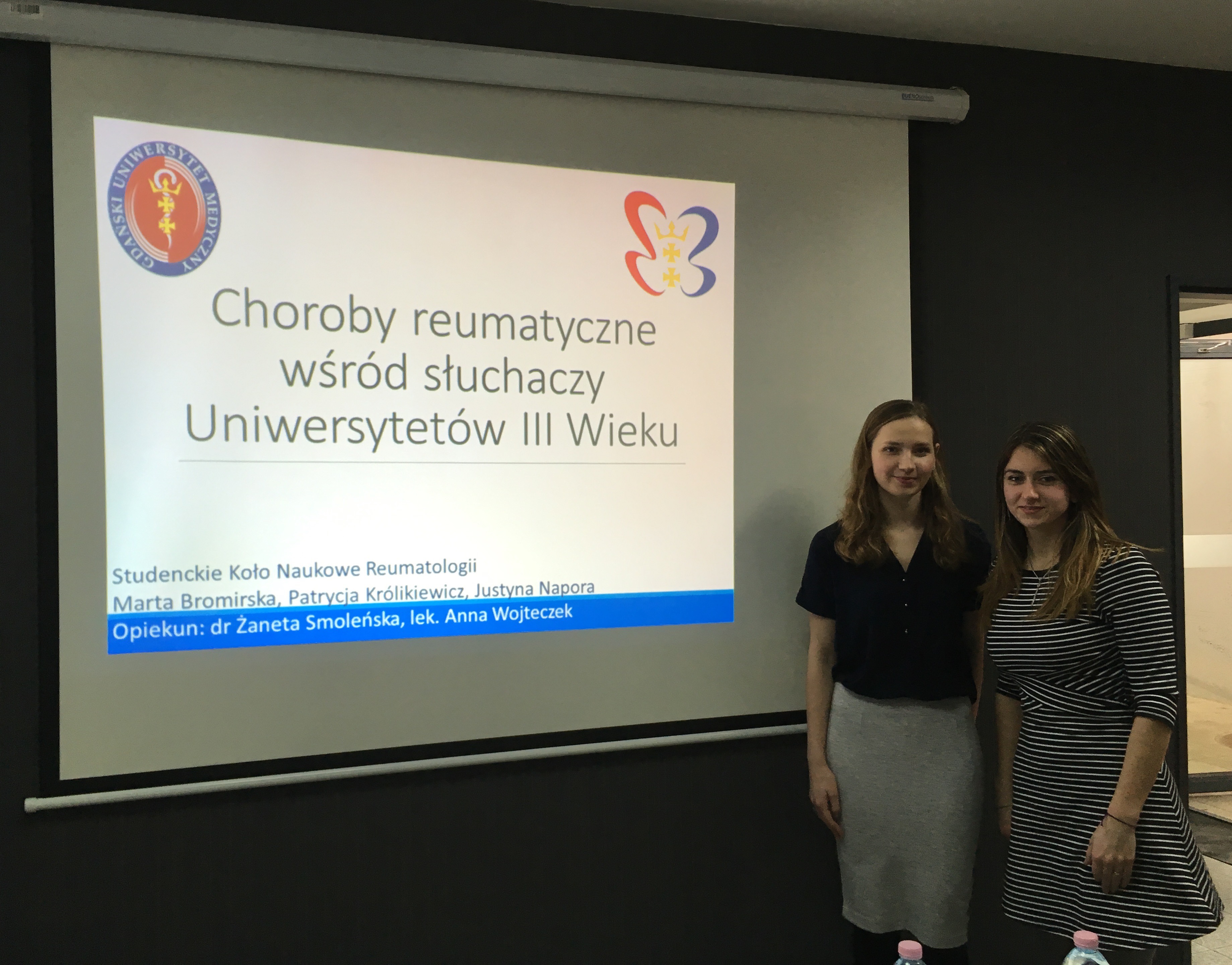 Leczenie stóp nie musi być tajemnicą. Udowodniły to Marta Bromirska, studentka GUMed działająca w SKN Reumatologii oraz Justyna Napora, studentka Collegium Medicum UMK, także związana z reumatologią. Pod opieką dr Żanety Smoleńskiej i lek. Anny Wojteczek z Katedry i Kliniki Chorób Wewnętrznych, Chorób Tkanki Łącznej i Geriatrii przeprowadziły pogadankę dla słuchaczy Uniwersytetu Trzeciego Wieku w Rumi. Temat wykładu, którego można było wysłuchać 4 marca br. obejmował różne schorzenia reumatyczne stóp, m.in. dnę moczanową, chorobę zwyrodnieniową i entezopatię. Pierwsza część spotkania obejmowała etiologię, czynniki ryzyka, objawy oraz leczenie schorzeń stóp. W drugiej części zostały omówione i pokazane ćwiczenia, które pacjent może wykonywać samodzielnie. Wystąpienie zostało bardzo dobrze przyjęte, a sam temat cieszył się dużym zainteresowaniem wśród słuchaczy.