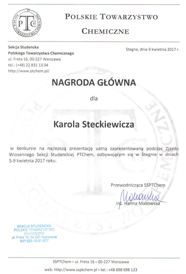 Karol Steckiewicz, student II roku kierunku lekarskiego, otrzymał nagrodę główną w konkursie na najlepszą prezentację ustną wygłoszoną podczas Zjazdu Wiosennego Sekcji Studenckiej Polskiego Towarzystwa Chemicznego. Praca doświadczalna została zatytułowana „Kliniczne zastosowanie nanocząstek metali przyszłość medycyny czy zagrożenie?”. Badania, których wyniki zostały zaprezentowane, były prowadzone w Katedrze i Zakładzie Chemii Medycznej. Współautorami pracy są pracownicy jednostki: mgr Ewelina Zielińska, dr hab. Iwona Inkielewicz-Stępniak oraz prof. Michał Woźniak.