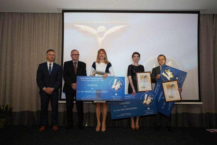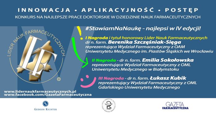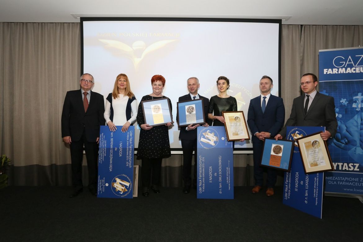 Dr Łukasz Kubik z Zakładu Biofarmacji i Farmakokinetyki GUMed został laureatem IV edycji konkursu Lider Nauk Farmaceutycznych na najlepsze prace doktorskie w dziedzinie farmacji obronione w latach 2015-2016. Otrzymał III nagrodę – dyplom i 5 tysięcy zł za pracę „Modelowanie zależności pomiędzy strukturą i retencją chromotograficzną związków dysocjujących”. W uznaniu sukcesów dydaktycznych uhonorowano również Wydział Farmaceutyczny GUMed brązowym medalem Scientia Nobilitat. Jest to trzeci laur Wydziału Farmaceutycznego GUMed w historii konkursu. Nagrody zostały wręczone 11 maja br. w Warszawie podczas obchodów XVI Dnia Polskiej Farmacji. Konkurs Lider Nauk Farmaceutycznych organizowany jest przez „Gazetę Farmaceutyczną” przy wsparciu firmy Gedeon Richter oraz Polskiego Towarzystwa Farmaceutycznego.