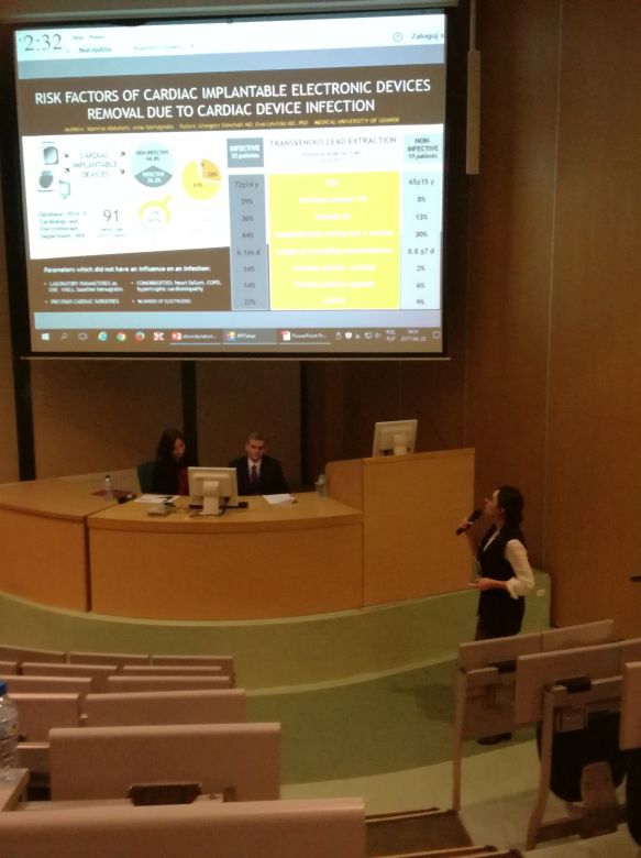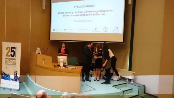 Anna Barczykowska, studentka VI roku kierunku lekarskiego zajęła I miejsce w sesji Dermatologia podczas 25 edycji International Medical Students Conference, która odbyła się w dniach 27-29 kwietnia br. w Krakowie. Zaprezentowała pracę „Where do we go wrong? Dermatological patients subjective assessment of satisfaction”, która powstała pod opieką dr hab. Anety Szczerkowskiej-Dobosz i dr Moniki Konczalskiej. Anna Szerszyńska, studentka VI roku kierunku lekarskiego wystąpiła z pracą „ECG abnormalities in male marathon amateur runners in comparison with ECHO findings”, za którą zdobyła III nagrodę w sesji Kardiologia. Współautorami pracy są Jakub Sobolewski, Julia Dyda i Jakub Koenner. Praca powstała pod opieką prof. Ewy Lewickiej i dr hab. Alicji Dąbrowskiej-Kugackiej z Kliniki Kardiologii i Elektroterapii Serca. Swoją pracę pt. „Risk factors of cardiac implantable electronic devices removal due to cardiac device infection” w sesji Kardiologia zaprezentowała również Yasmina Abdulaziz, studentka VI r. kierunku lekarskiego. Współautorem pracy jest Anna Szerszyńska. Praca powstała pod opieką prof. Ewy Lewickiej i lek. Grzegorza Sławińskiego.