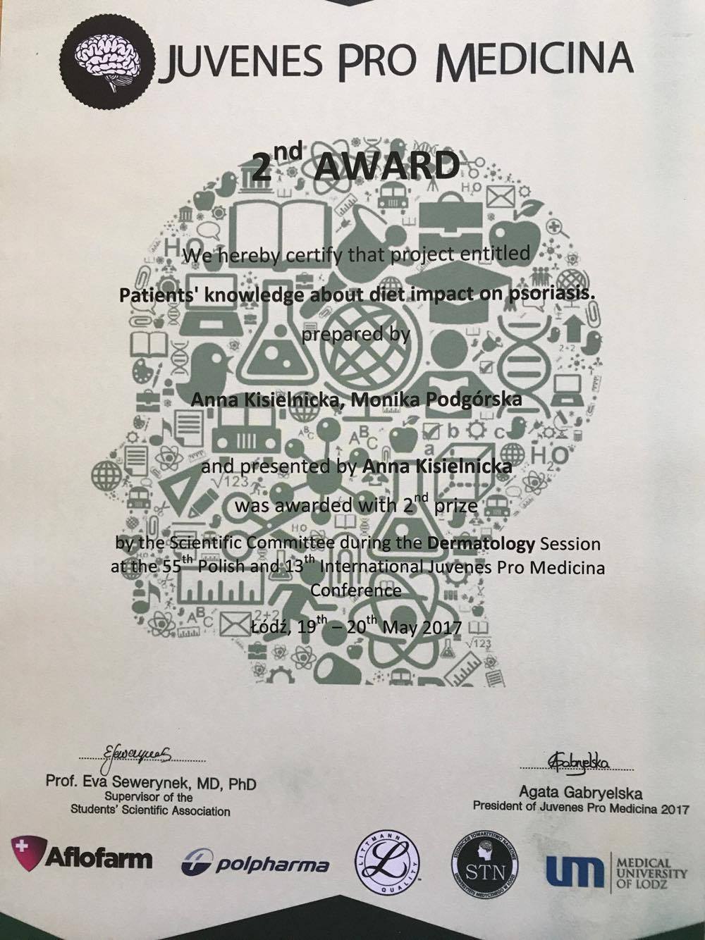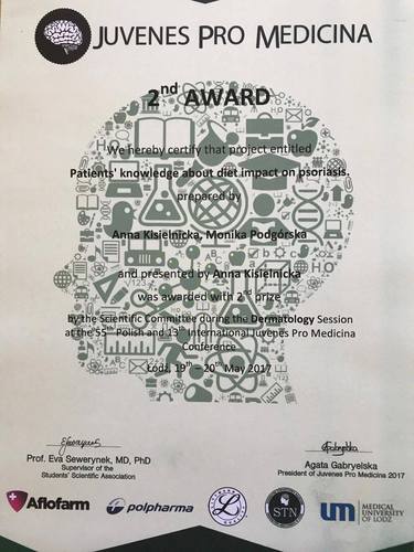 Anna Kisielnicka, studentka IV roku kierunku lekarskiego GUMed, zajęła 2 miejsce w sesji Dermatologia podczas 55 edycji polskiej i 13 edycji międzynarodowej konferencji Juvenes Pro Medicina, która odbyła się w dniach 19-20 maja br. w Łodzi. Praca “Patients knowledge about diet impact on psoriasis”, której współautorką jest Monika Podgórska, powstała pod opieką dr hab. Anety Szczerkowskiej-Dobosz oraz dr Moniki Konczalskiej z Katedry i Kliniki Dermatologii, Wenerologii i Alergologii.