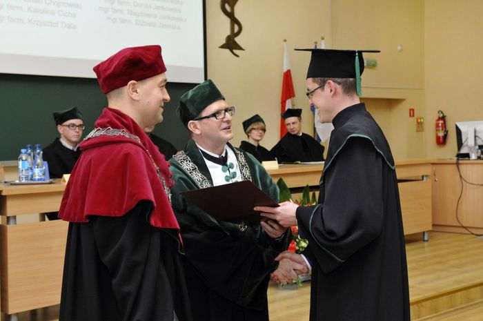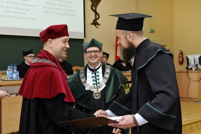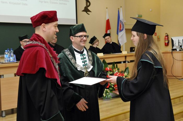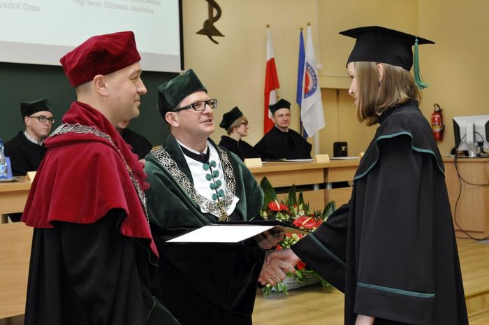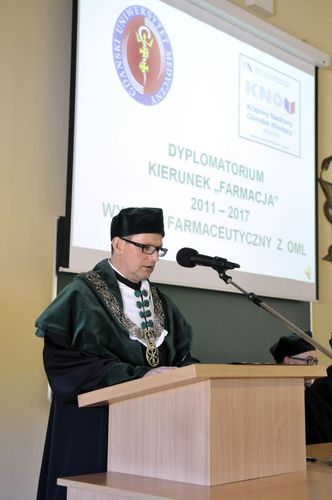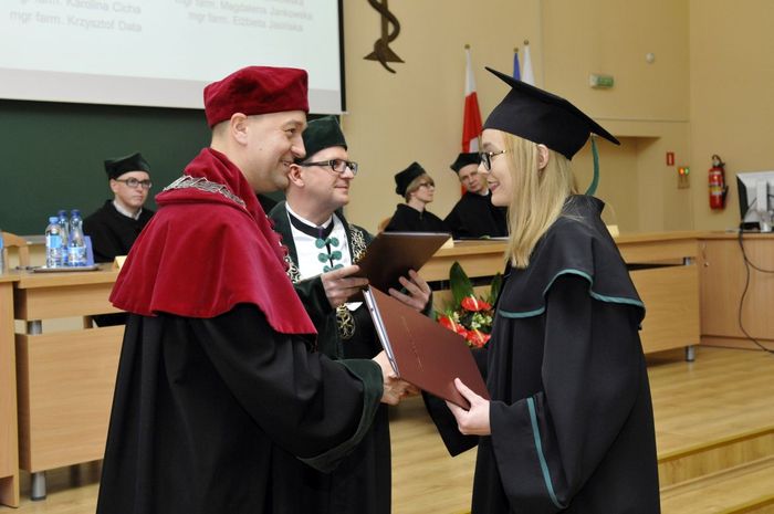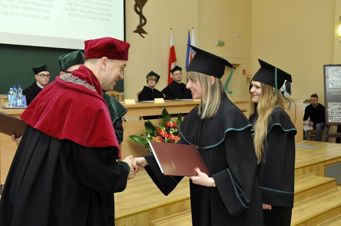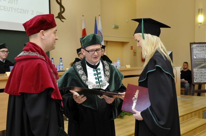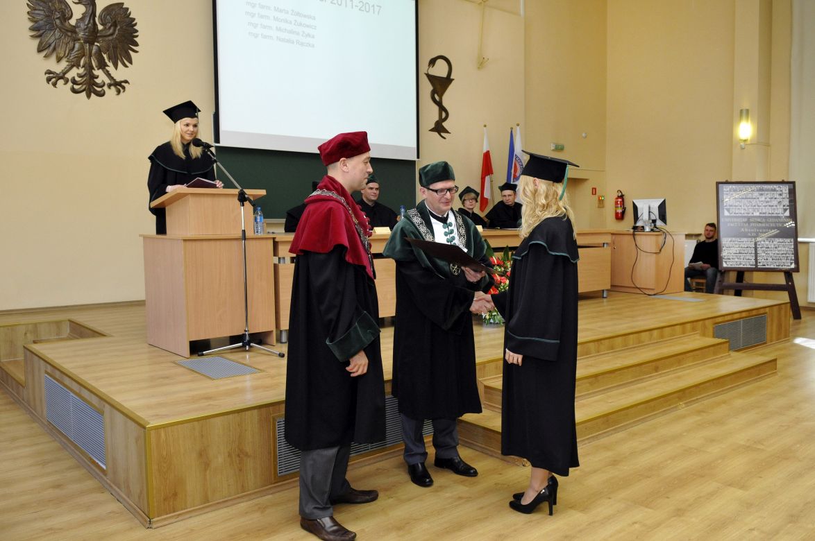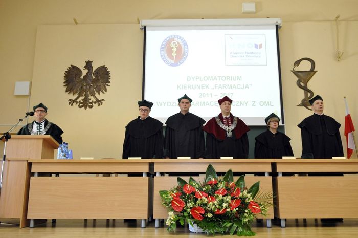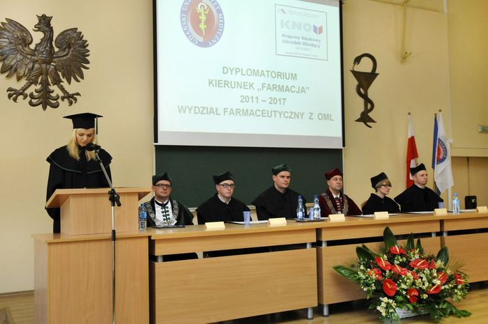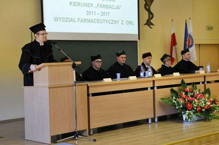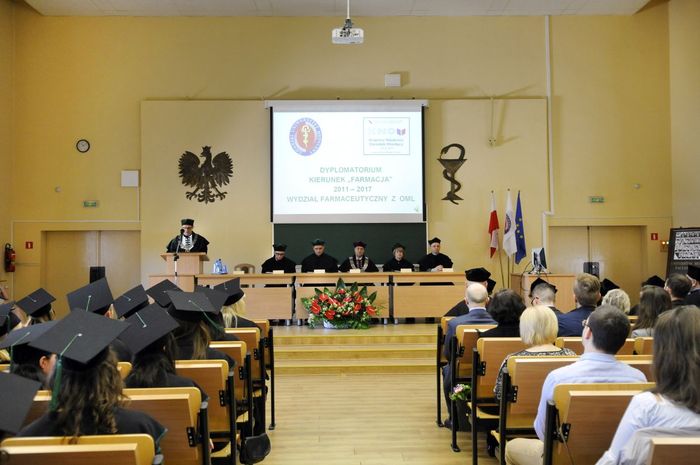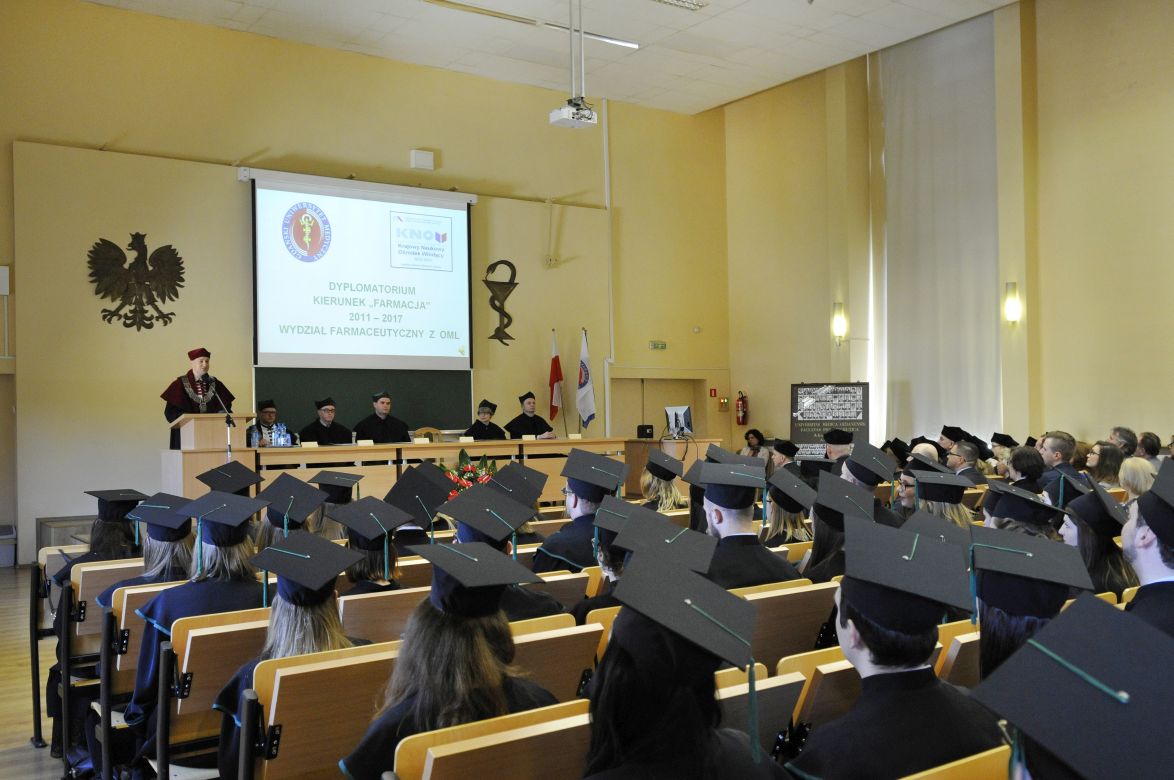 Wręczenie dyplomów ukończenia studiów absolwentom kierunku farmacja rocznika 2011-2017 odbyło się 12 maja 2017 r. w Auditorium Maximum Wydziału Farmaceutycznego. W uroczystości, której przewodniczył dziekan WF z OML prof. Michał Markuszewski, uczestniczyli: prorektor ds. nauki prof. Tomasz Bączek, prodziekani – prof. Arkadiusz Piotrowski, dr hab. Bartosz Wielgomas, dr hab. Anita Kornicka i prof. Maciej Jankowski, członkowie Rady Wydziału, zaproszeni goście oraz rodziny absolwentów.