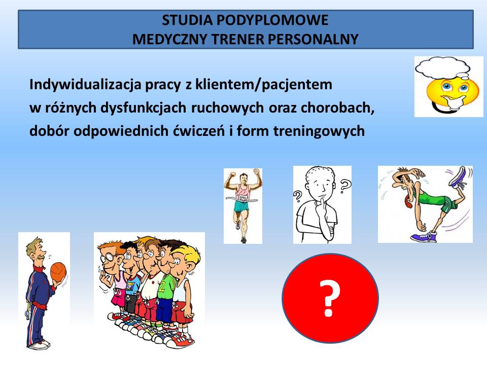 Gdański Uniwersytet Medyczny prowadzi nabór na studia podyplomowe na kierunek medyczny trener personalny. Kierunek jest odpowiedzią na potrzeby rynku, jest pomostem łączącym gabinet fizjoterapeuty, dietetyka oraz trenera specjalisty z zakresu prawidłowej aktywności fizycznej. Obejmuje indywidualizację pracy z klientem/pacjentem w różnych dysfunkcjach ruchowych oraz chorobach. Studia wyposażą uczestnika w wiedzę i umiejętności praktyczne z zakresu diagnostyki, metod i form treningowych, planowania treningu zdrowotnego i terapeutycznego. Ponadto kierunek tych studiów dostarczy słuchaczom umiejętności praktycznych i wiedzy w zakresie programowania aktywności fizycznej, żywienia, suplementacji, usług marketingowych i przedsiębiorczości. Absolwent otrzyma świadectwo ukończenia studiów podyplomowych upoważniające do prowadzenia własnej działalności gospodarczej oraz podjęcia zatrudniania jako specjalista m.in. w ośrodkach odnowy biologicznej, siłowniach, klubach fitness, klubach sportowych, hotelach z infrastrukturą rekreacyjną.