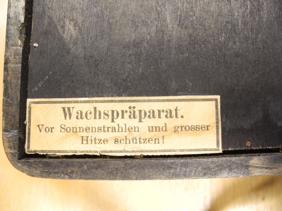 Drewniana skrzynka ze szklaną pokrywą, o wymiarach 24×32 cm, wyprodukowana została w Berlinie, w wytwórni pomocy naukowych (Lehrmittelwerke Berlinische Verlagsanstalt G.M. b. H., Berlin N.W. 23). Zawiera woskowe modele przekrojów zębów, których miazga zaatakowana została przez różne choroby. Zęby są znaczenie powiększone, struktury anatomiczne w żywych kolorach, a widoczne ubytki przyprawiają o dreszcz niepokoju. Modele zębów wykonano z wosku, o czym informuje napis na odwrocie pojemnika, przestrzegający również przed ekspozycją na promienie słoneczne oraz wysoką temperaturę z grzejników.