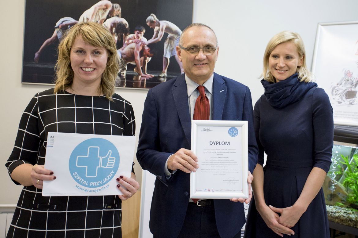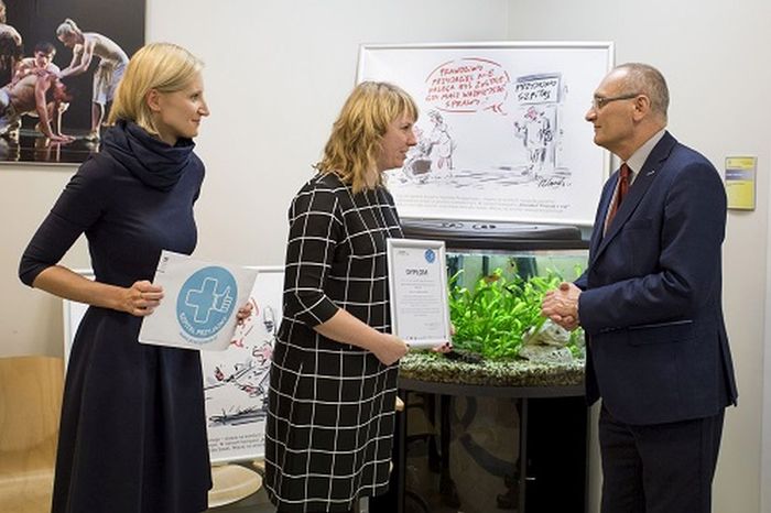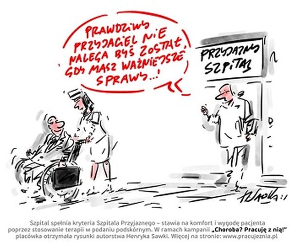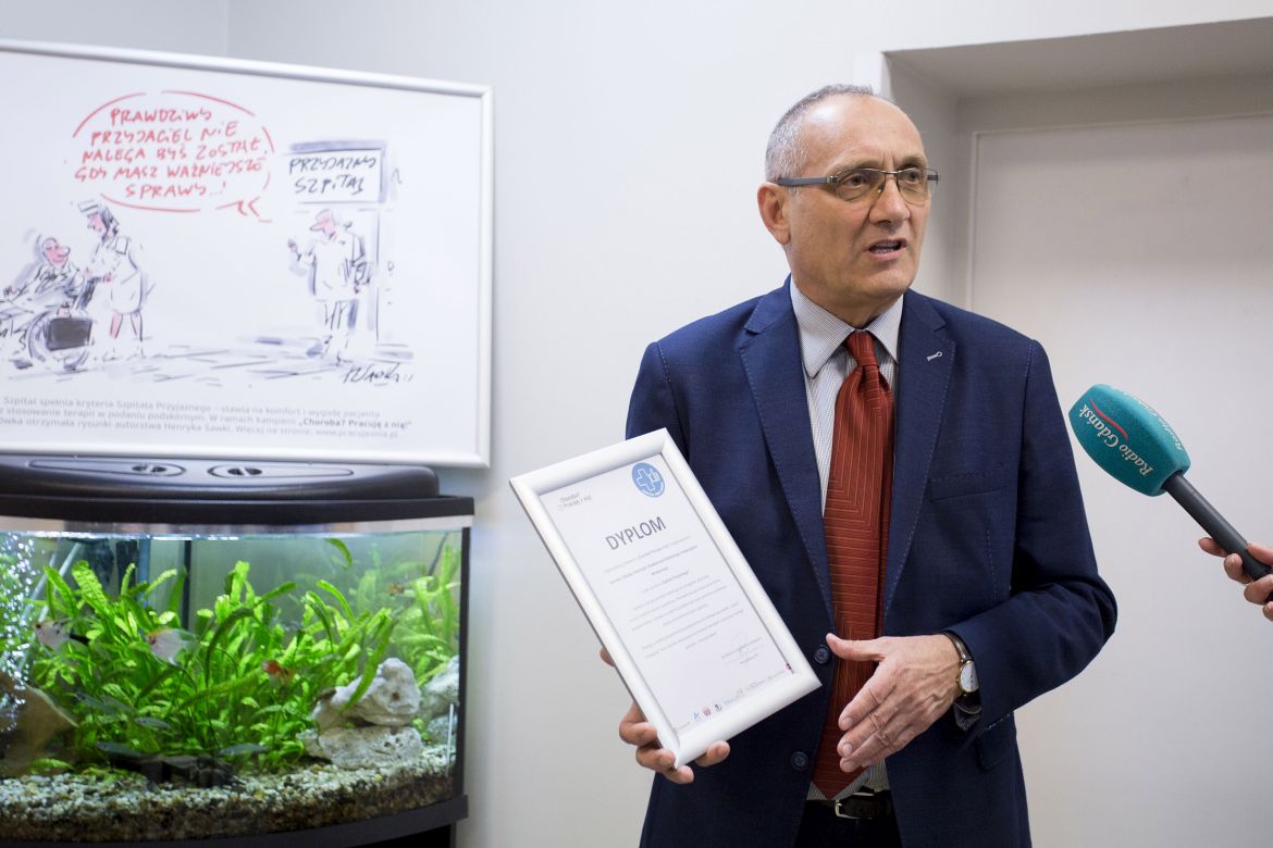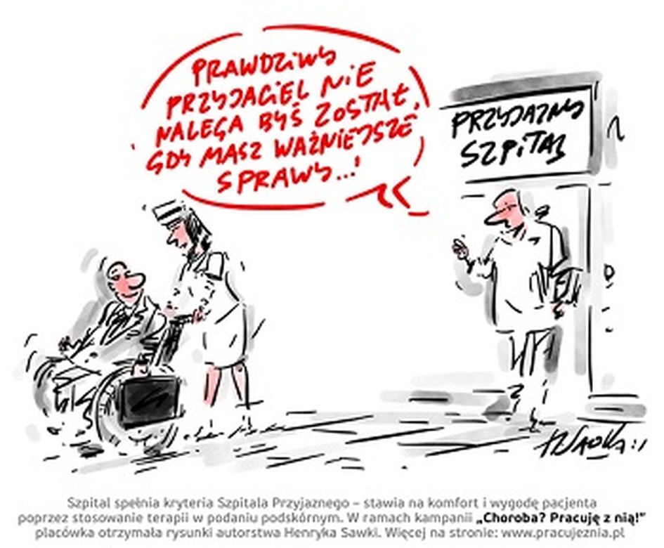 Klinika Onkologii i Radioterapii Uniwersyteckiego Centrum Klinicznego została wyróżniona godłem „Szpital Przyjazny”, przyznawanym placówkom, które w codziennej praktyce starają się pomóc pacjentom godzić leczenie z pracą. Wyróżnienie wraz z grafiką Henryka Sawki, przedstawiającej z humorem, jak ważne dla pracujących pacjentów są łatwe i wygodne w podaniu terapie, skracające czas pobytu chorego w szpitalu, odebrał 2 października br. kierownik Kliniki prof. Jacek Jassem z rąk koordynatorki kampanii „Choroba? Pracuję z nią” Aleksandry Sienkiewicz i przedstawicielki zarządu Fundacji Onkologicznej „Alivia” Anny Moskal. Organizatorzy pod uwagę brali dwa kryteria: możliwość umówienia wizyty pacjenta na konkretną godzinę oraz korzystanie z wygodnych terapii skracających czas podania leku, jakimi są np. terapie podskórne.