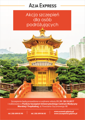 Wszystkie azjatyckie podróże mają jedną cechę wspólną: warto się do nich rzetelnie przygotować pod względem zdrowotnym. Bezpieczeństwo podróży można znacząco podnieść poprzez szczepienia ochronne przed wyjazdem. Specjaliści z Uniwersyteckiego Centrum Medycyny Morskiej i Tropikalnej (UCMMiT) zdają sobie z tego sprawę i z tej okazji 21 oraz 28.10 br. w godz. 9.00 – 13.00 zapraszają na akcję szczepień dla podróżujących.