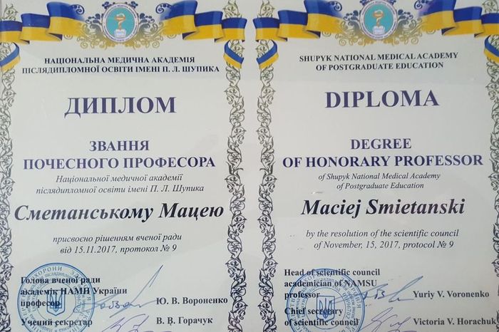 Dr hab. Maciej Śmietański z II Zakład Radiologii GUMed został Honorowym Profesorem (odpowiednik doktora honoris causa) Narodowego Uniwersytetu Medycznego Kształcenia Podyplomowego Ukrainy oraz Honorowym Ambasadorem Lwowa.
