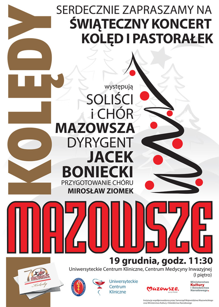 Gdański Uniwersytet Medyczny i Uniwersyteckie Centrum Kliniczne zapraszają na świąteczny koncert kolęd i pastorałek w wykonaniu zespołu Mazowsze. Spotkanie odbędzie się we wtorek, 19 grudnia br. o godz. 11:30 w Centrum Medycyny Inwazyjnej GUMed – I piętro, okolice audytorium im. prof. Kieturakisa.