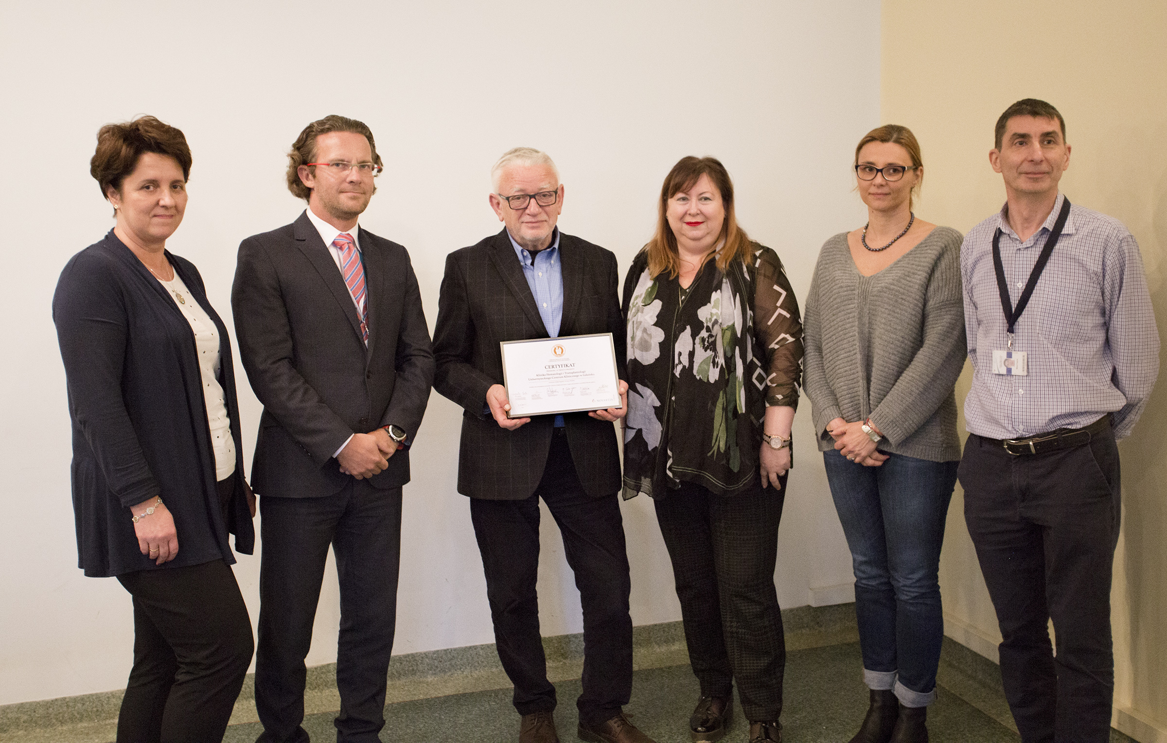 Prof. Andrzej Hellmann, ordynator Klinki Hematologii i Transplantologii UCK odebrał 14 grudnia br. z rąk dr Janiny Książek, prezesa Oddziału Terenowego Polskiego Stowarzyszenia Pielęgniarek Onkologicznych w Gdańsku certyfikat „W trosce o pacjenta”. Wyróżnienie to sygnał dla chorych na przewlekłą białaczkę szpikową oraz ich rodzin, że w gdańskim ośrodku pacjenci otrzymają profesjonalną pomoc, merytoryczne wsparcie oraz szereg niezbędnych informacji na temat choroby, celów terapeutycznych, niezwykle istotnych w skutecznym leczeniu. W uroczystości udział wzięli także: dyrektor ds. lecznictwa Tomasz Stefaniak, zastępca dyrektora naczelnego ds. pielęgniarstwa Anna Lignowska oraz pracownicy Kliniki Hematologii i Transplantologii Uniwersyteckiego Centrum Klinicznego w Gdańsku. Klinika jest jednym z nielicznych ośrodków w Polsce uhonorowanym tego typu certyfikatem.