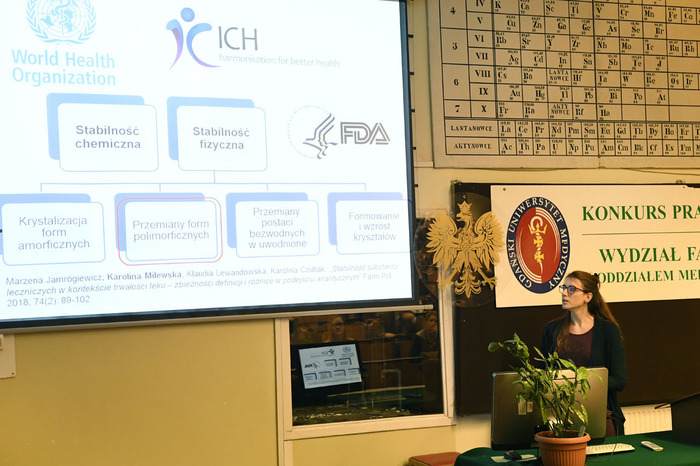 W komisji konkursowej zasiedli: dr hab. Anita Kornicka (Katedra i Zakład Technologii Chemicznej Środków Leczniczych), prof. Maria Łuczkiewicz (Katedra i Zakład Farmakognozji), prof. Marek Wesołowski (Katedra i Zakład Chemii Analitycznej), dr hab. Katarzyna Gobis (Katedra i Zakład Chemii Organicznej), dr hab. Piotr Kowalski, prof. nadzw. (Katedra i Zakład Chemii Farmaceutycznej) oraz przedstawiciele studentów: Anita Będźkowska i Emilia Sieniawska.