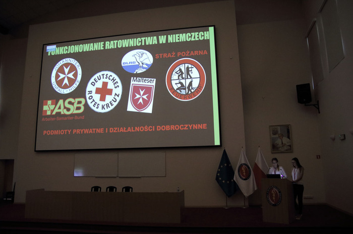 Sesja prezentacji została podzielona na trzy bloki tematyczne. W pierwszym bloku zostały zaprezentowane tematy z zakresu m.in. współpracy Policji z systemem Państwowego Ratownictwa Medycznego, aktualnych zmian z zakresu ochrony danych osobowych oraz przestrzegania praw pacjenta ze szczególnym uwzględnieniem prawa do godności, prywatności i intymności. Przedstawiona została również prelekcja ukazująca system ratownictwa medycznego w Niemczech, pracę jaką wykonują psy działające w ramach grup poszukiwawczych oraz omówiono temat założenia działalności gospodarczej przez ratownika medycznego.