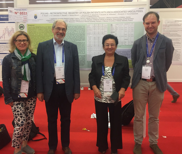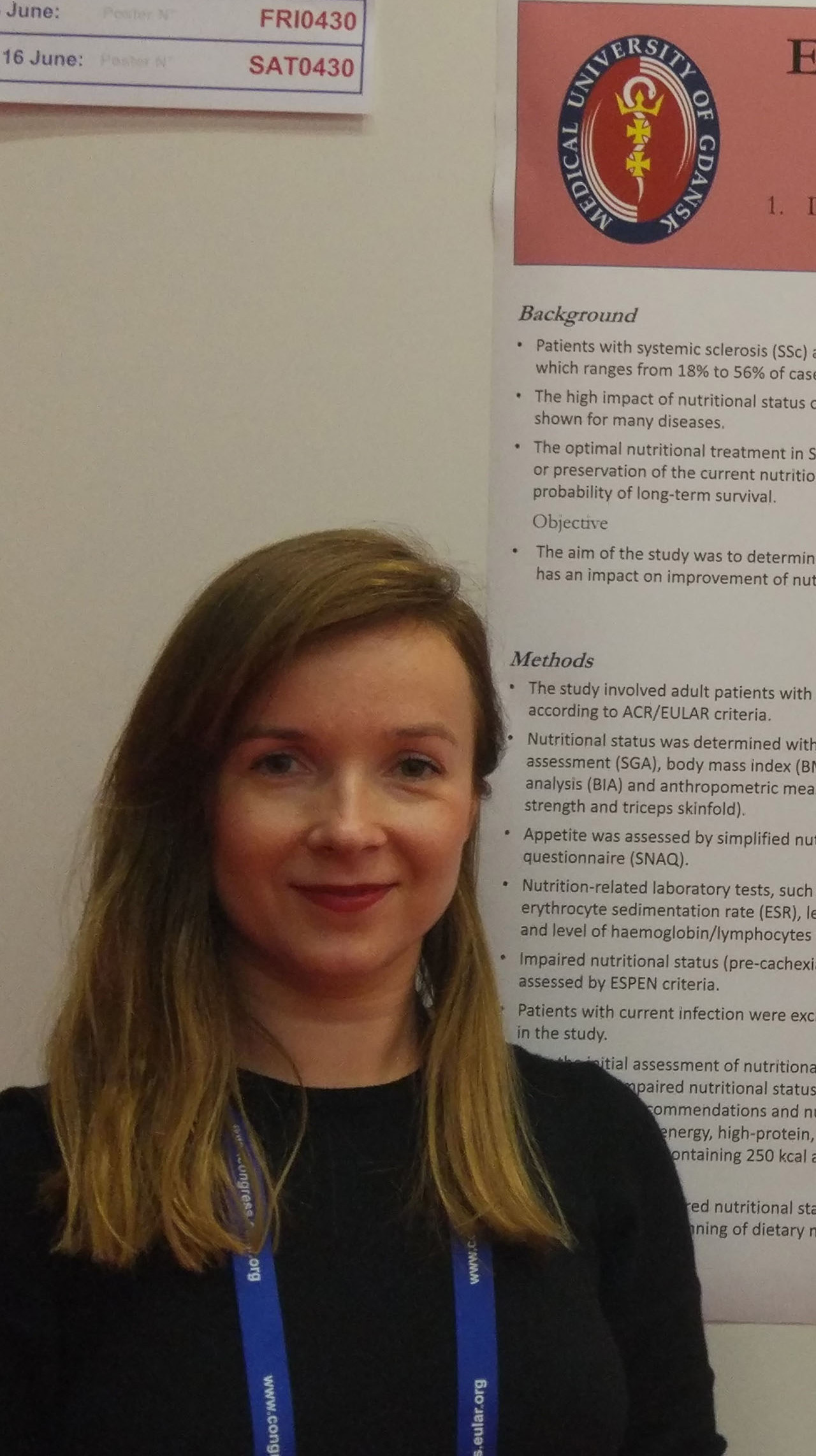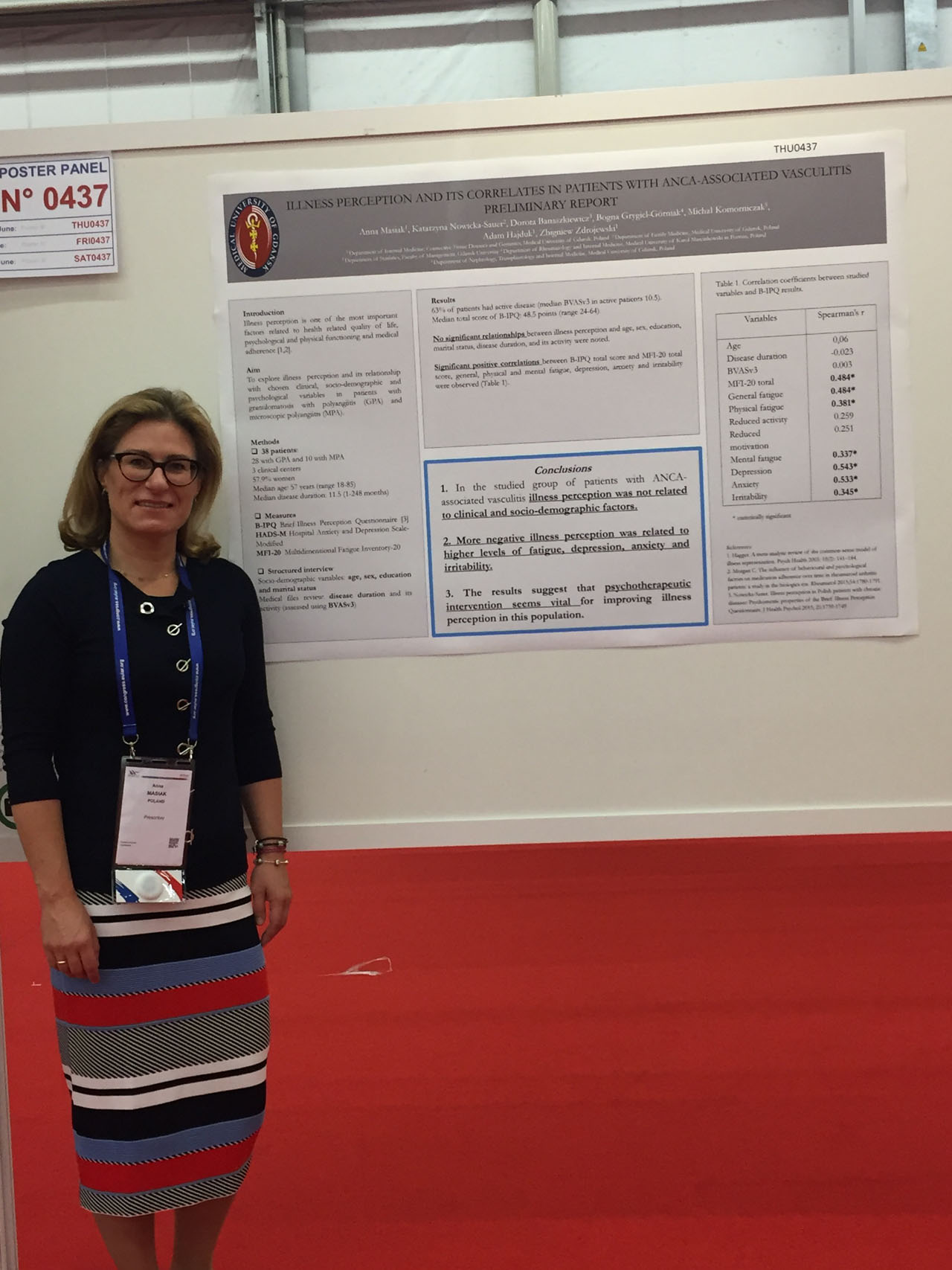 Doktorantka Anna Wojteczek w sesji plakatowej dotyczącej twardziny układowej przedstawiła pracę „Effect of oral nutritional intervention on nutritional status in patients with systemic sclerosis”. Doktor Anna Masiak w sesjach plakatowych dotyczących zapaleń naczyń przedstawiła prace „Illness preception and its correlates in patients with ANCA-associated vasculitis – preliminary report” oraz „Correlates of fatigue in ANCA-associated vasculitis” (prace powstały dzięki współpracy z dr Katarzyną Nowicką-Sauer z Katedry Medycyny Rodzinnej GUMed oraz przy współudziale lekarzy z Kliniki Nefrologii, Transplantologii i Chorób Wewnętrznych GUMed oraz Kliniki Reumatologii i Chorób Wewnętrznych Uniwersytetu Medycznego w Poznaniu). Dr Masiak była również współautorem doniesienia plakatowego prezentującego wyniki polskiego rejestru zapaleń naczyń „POLVAS – retrospective registry of polish patients with ANCA-associated vasculitides”.